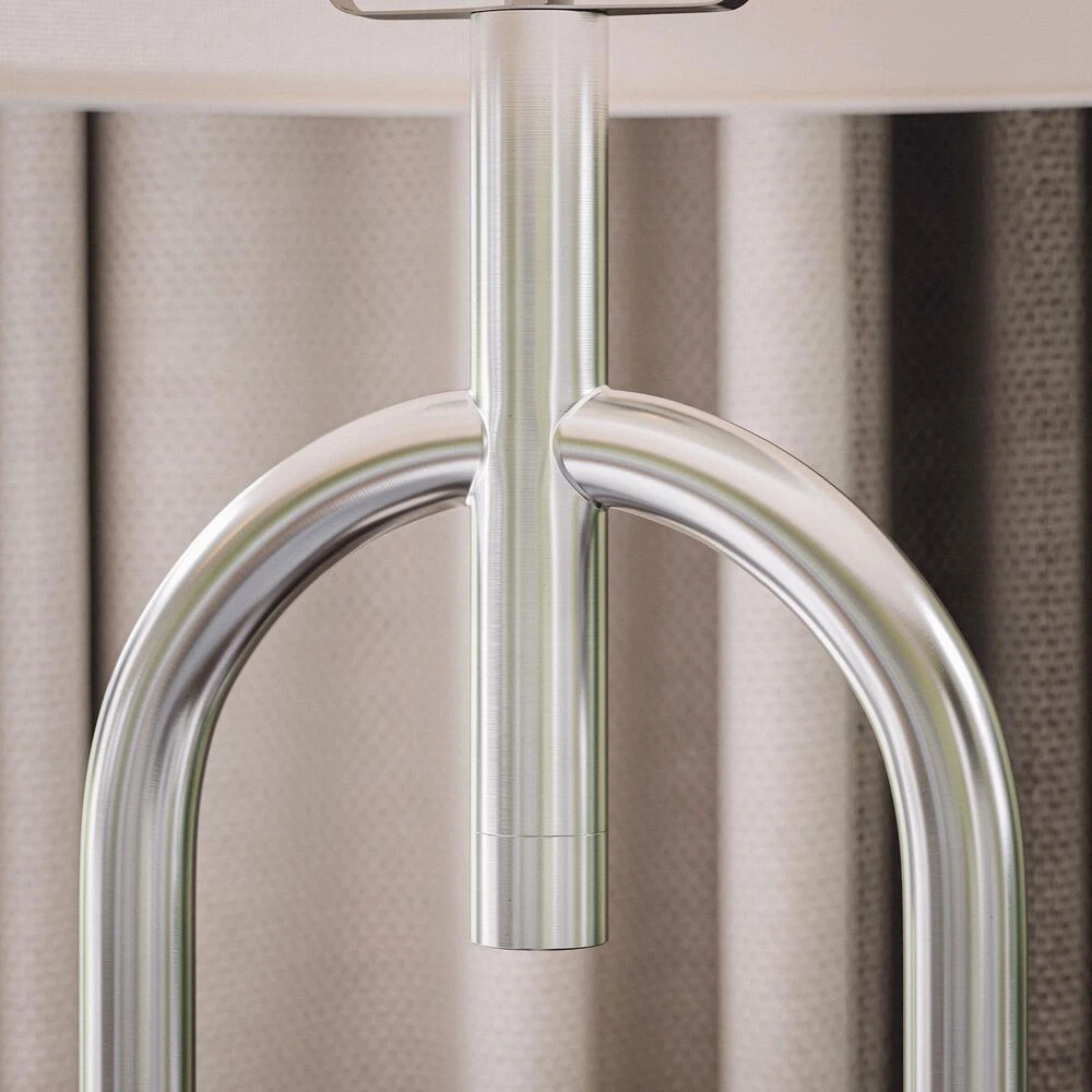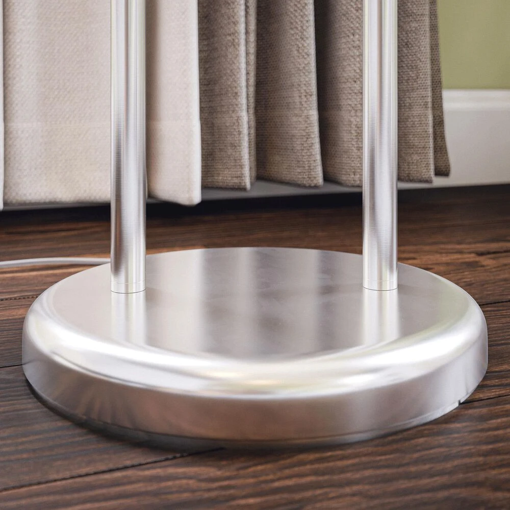 With a tall, almost retro design, this stylish contemporary floor lamp’s tubular body and shimmering brushed steel serve as a modern accent in your living room. A crisp white drum shade creates brilliant illumination – perfect for use as a reading light next to your accent chairs or sofa. A convenient pole switch allows for quick and easy operation.