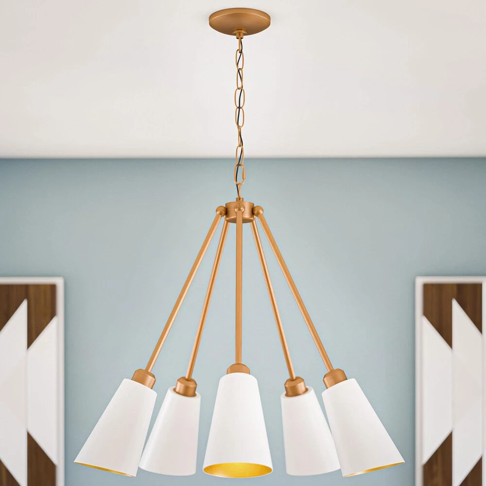 A tale of two finishes with a matte white and glimmering gold, this 5 light chandelier combines the clean-lined aesthetic of Art Deco design with a modern light and airy look perfect for your Mid-Century modern home. Install this stunning accent in your foyer to greet guests with the warm cascade of light, made brighter by the metallic gold lined slant cut shades. Hang in your vaulted ceiling dining room for a modern accent that complements your metallic table settings and luxe home decor. This posh chandelier will provide plenty of luxe style and bright lighting to your modern living spaces.