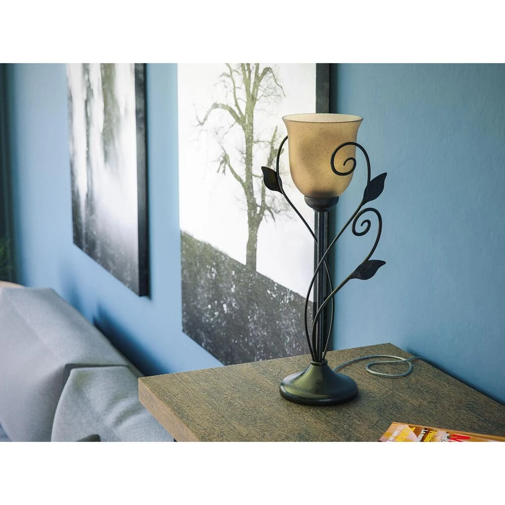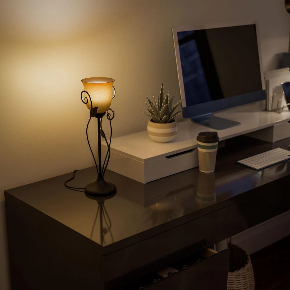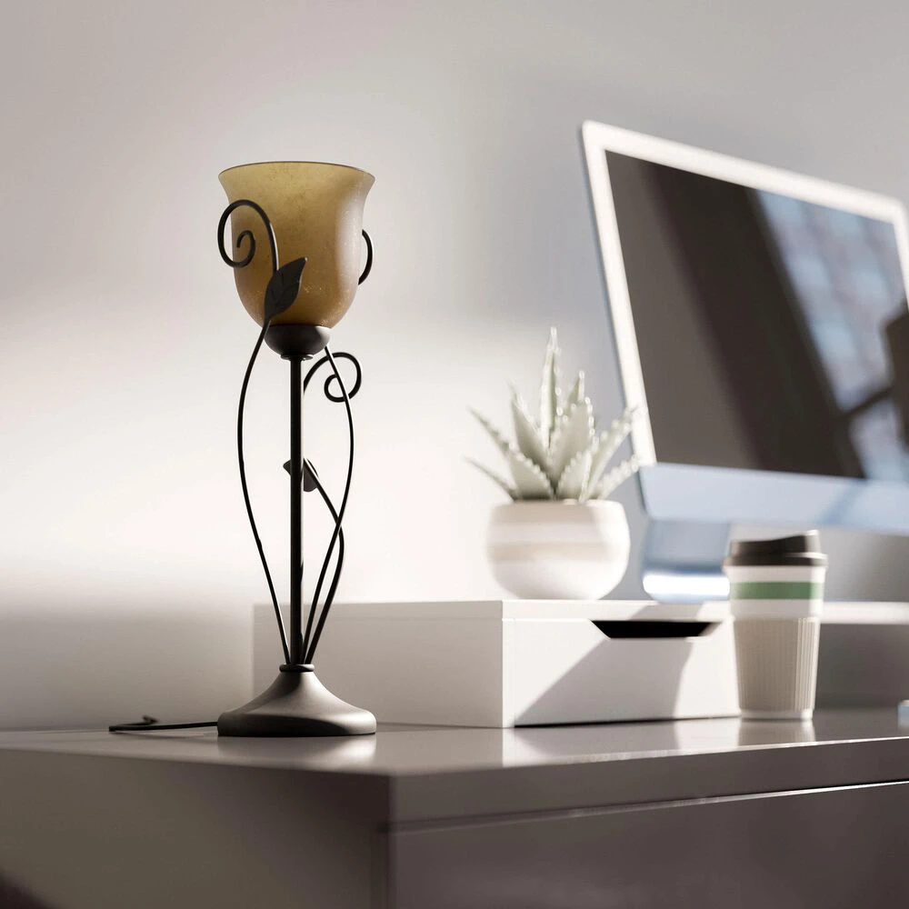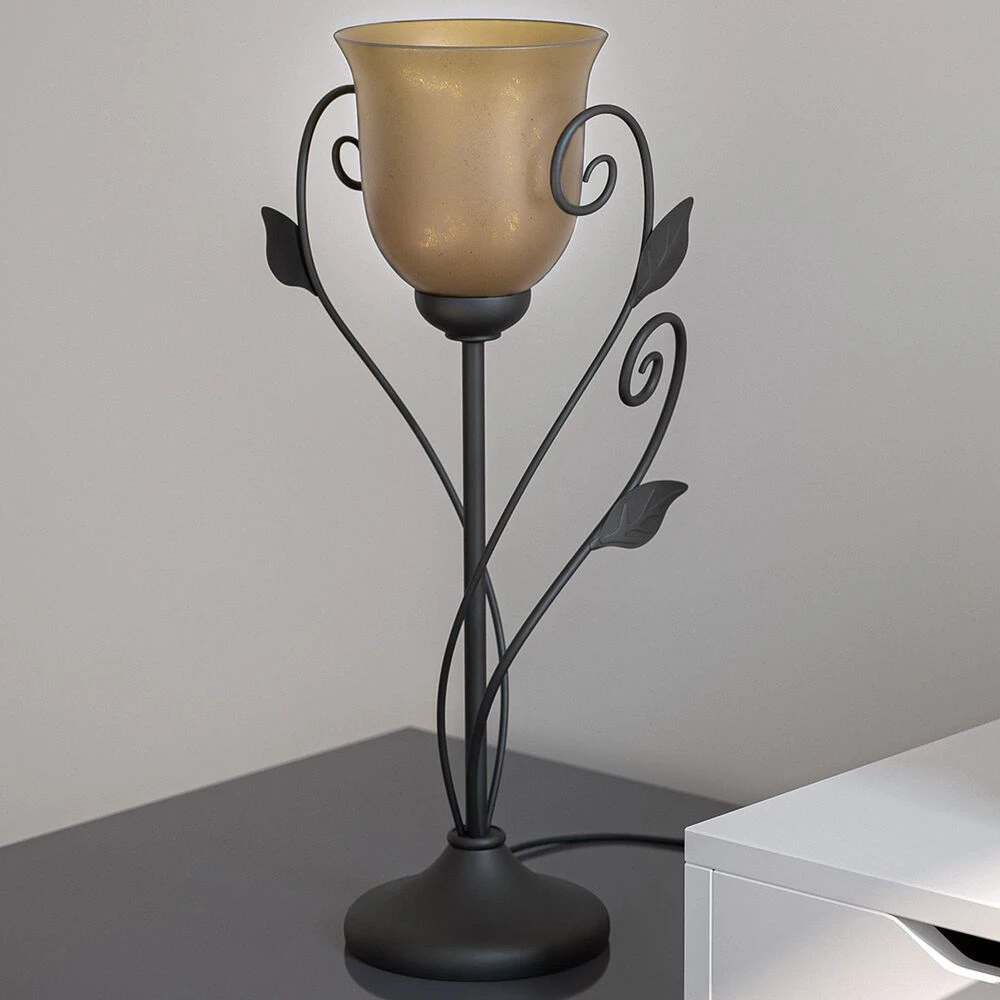 - Amber glass shade for a warm, diffused glow