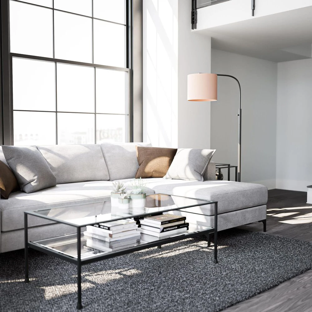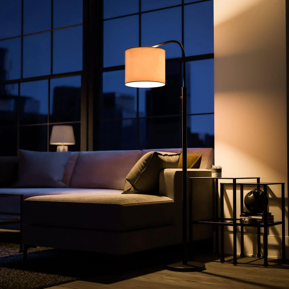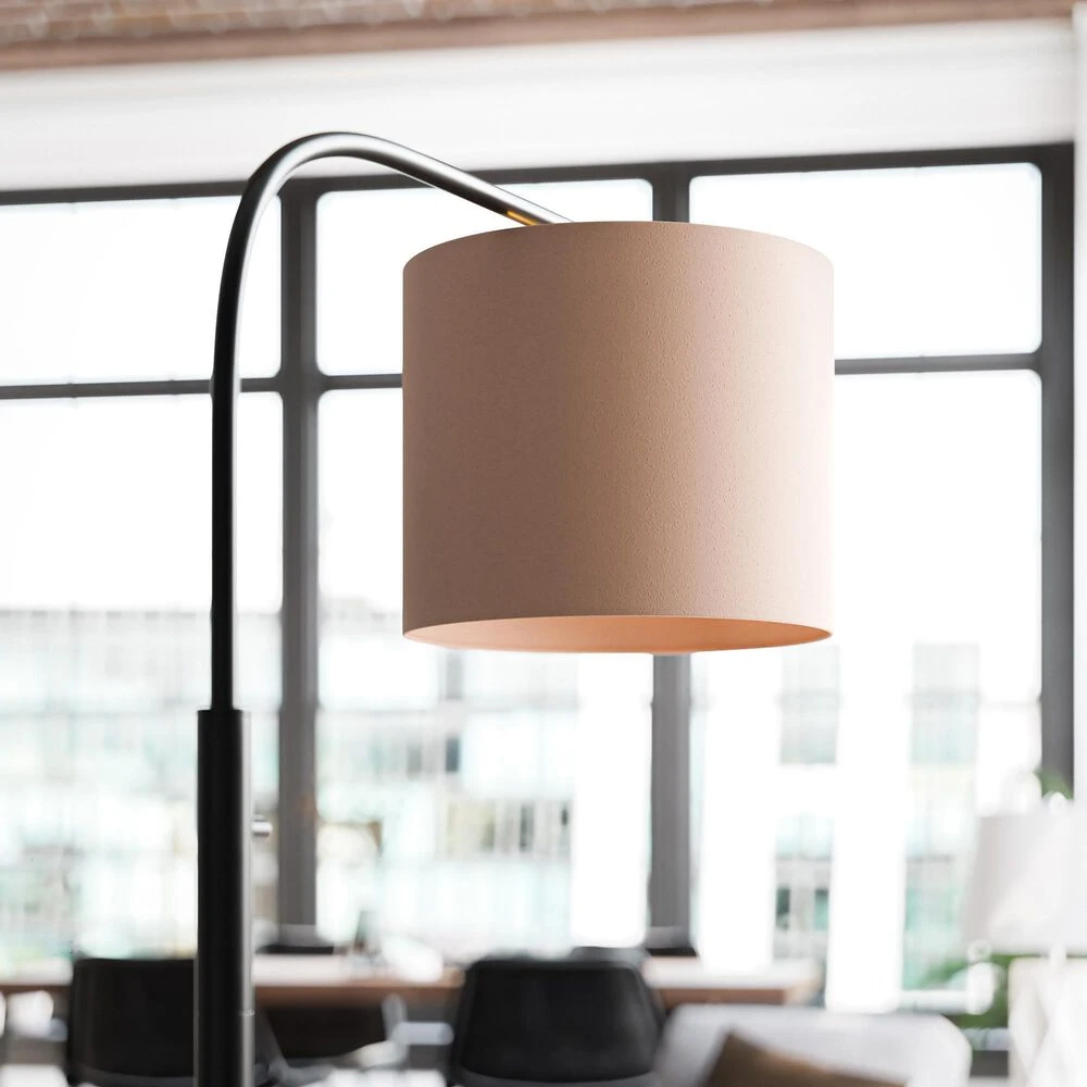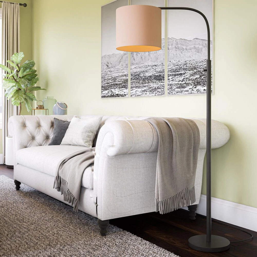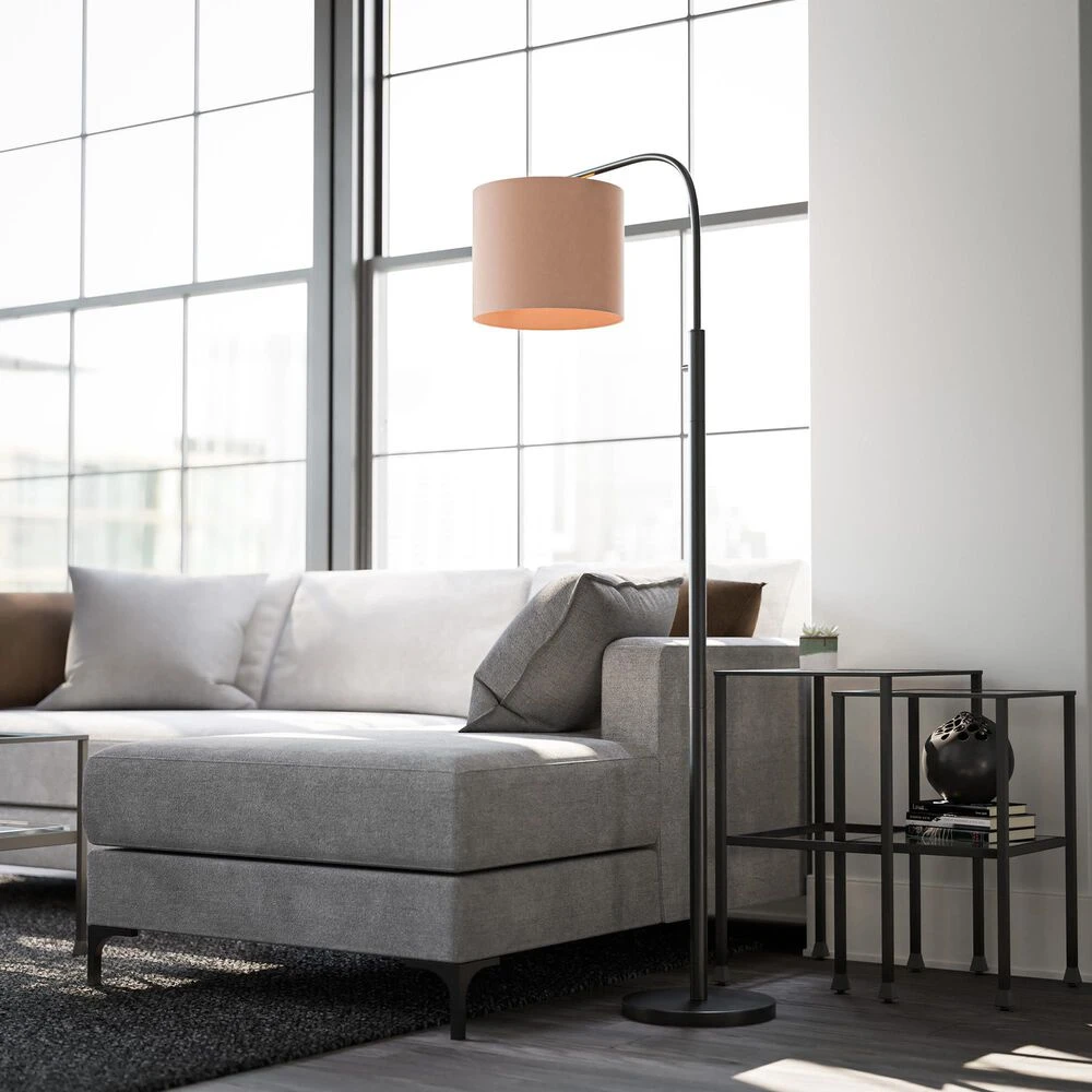 This transitional arc floor lamp’s unique profile is perfect for illuminating small spaces. The slim base and arced shade makes the perfect lighting element to tuck away behind furniture or in corners. A rich bronze finish and tan drum shade adds warm tones and classic style.