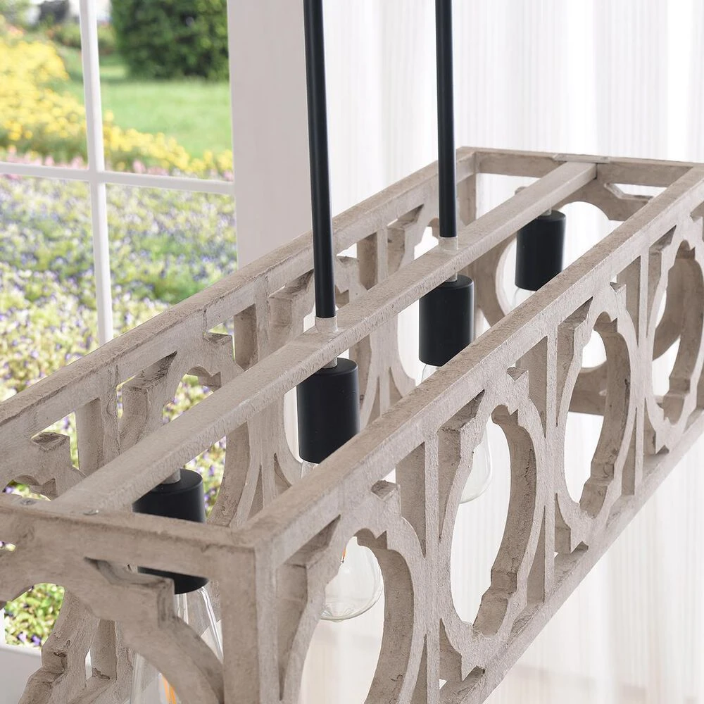 A little dash of bohemian, a little splash of vintage casual and a heaping dose of rustic charm creates this contemporary distressed kitchen island light. The weathered white frame contrasts with the black-finished hardware to create an elegant look perfect for your modern farmhouse home. The unique rectangular shade is left open to showcase the bulbs, framed by a quatrefoil design perfect for use with vintage-style Edison bulbs or other designer bulbs. Compatible with vaulted, sloped ceilings, easily install your kitchen island light over a modern farmhouse kitchen island for a bright, area-filling glow with task lighting perfect for meal prepping.