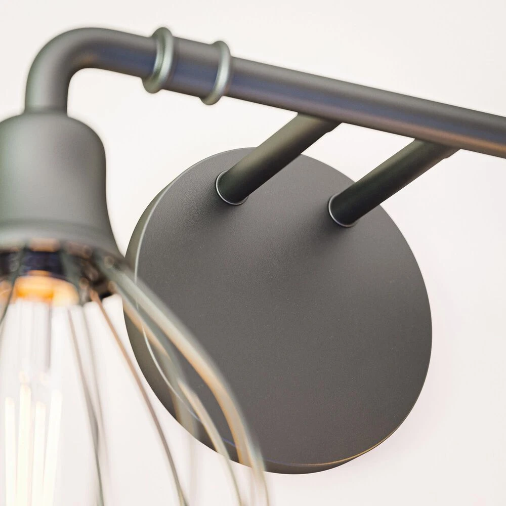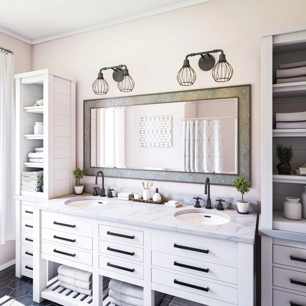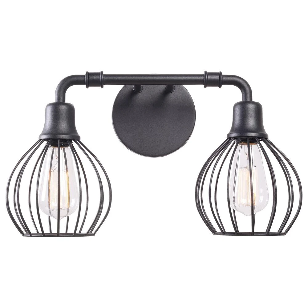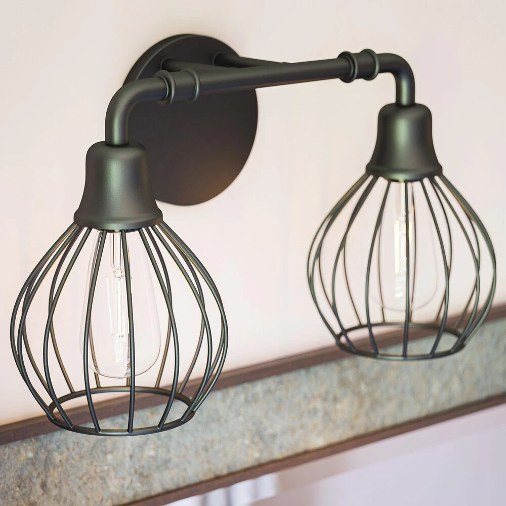 This edgy urban contemporary 2 light vanity fixture is sure to bring plenty of bright lighting and effortless modern style to your industrial master bathroom. Matte black finished wire frame shades give a modern industrial feel, while the open shades allow your choice of bulb to freely shine – perfect for use with vintage-style Edison bulbs or other designer bulbs.