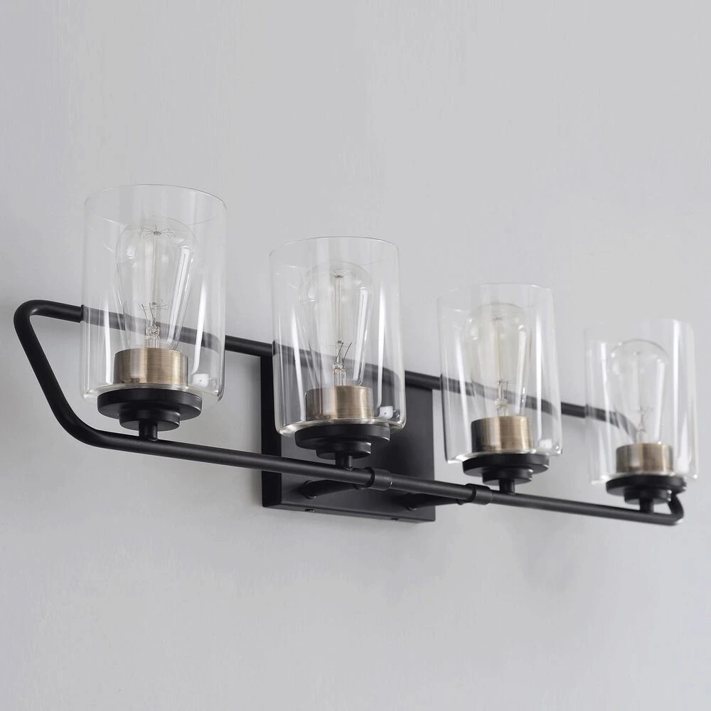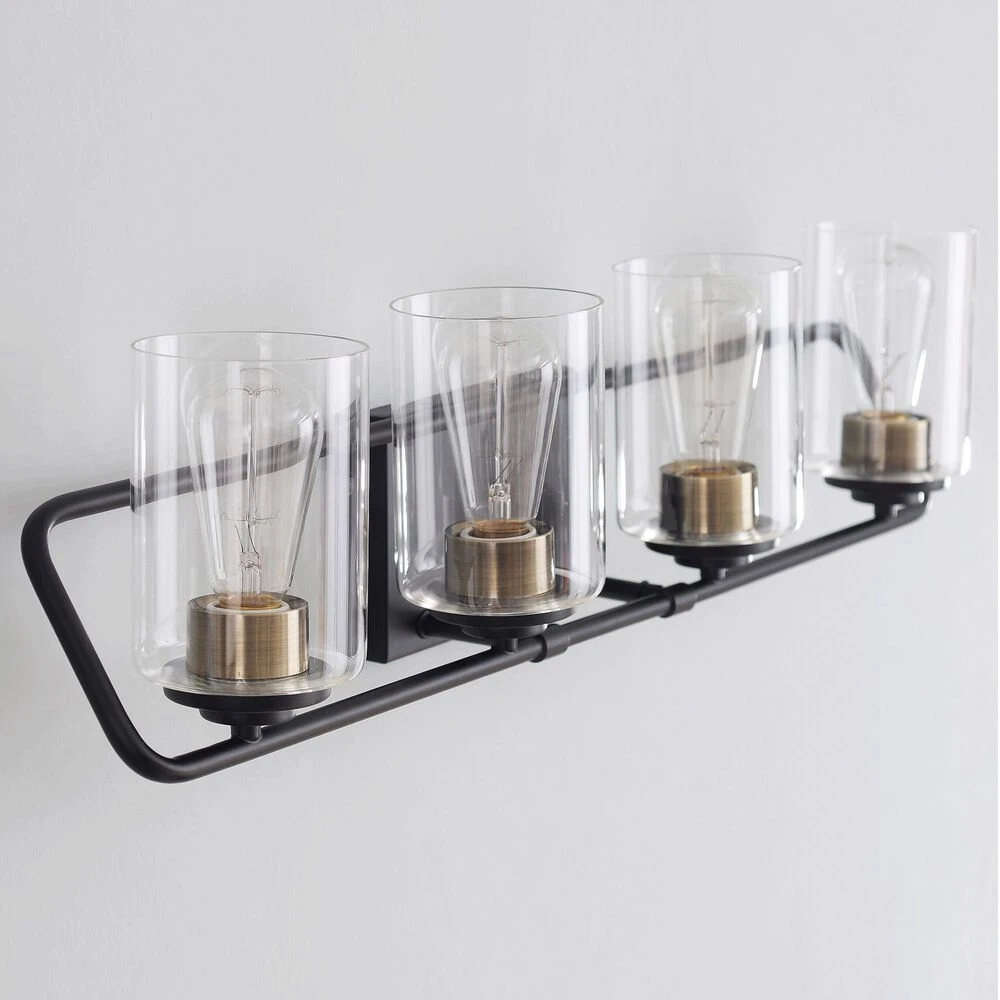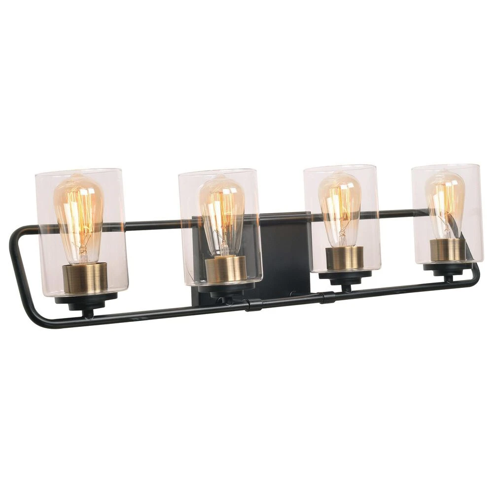 Youve covered your home with your own brand of vintage-industrial style why not bring urban charm into your master bathroom as well? This Mid-Century Modern vanity fixture with its industrial elements and mixed material vibe will help you jumpstart your morning routine with its warm, vintage light. A matte black finish hugs the rounded corners of the pipe-like open frame of this fixture, contrasting with the brilliantly polished antique brass accents. A simple, yet ultra-refined, glass shade contains the included vintage Edison bulbs. With your choice of a three-light or four-light fixture, youll have plenty of bright illumination to start your day on a high note.