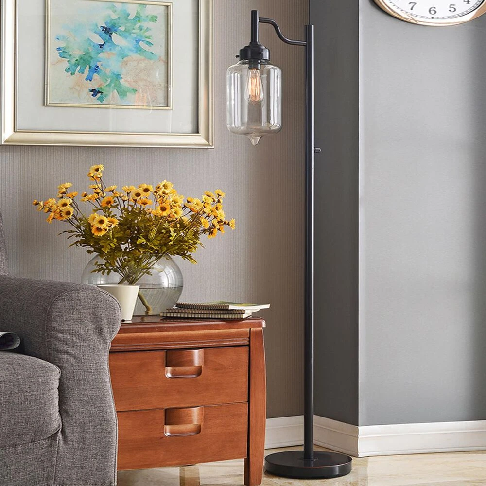 - SWEEPING HEIGHT: The nearly 58 inch tall profile of this lamp is the perfect height to tuck away behind a couch while still showcasing the luxuriously styled clear glass pendant. The On/Off pole switch is positioned halfway up the pole to allow you to conveniently control the light level from a sitting position.