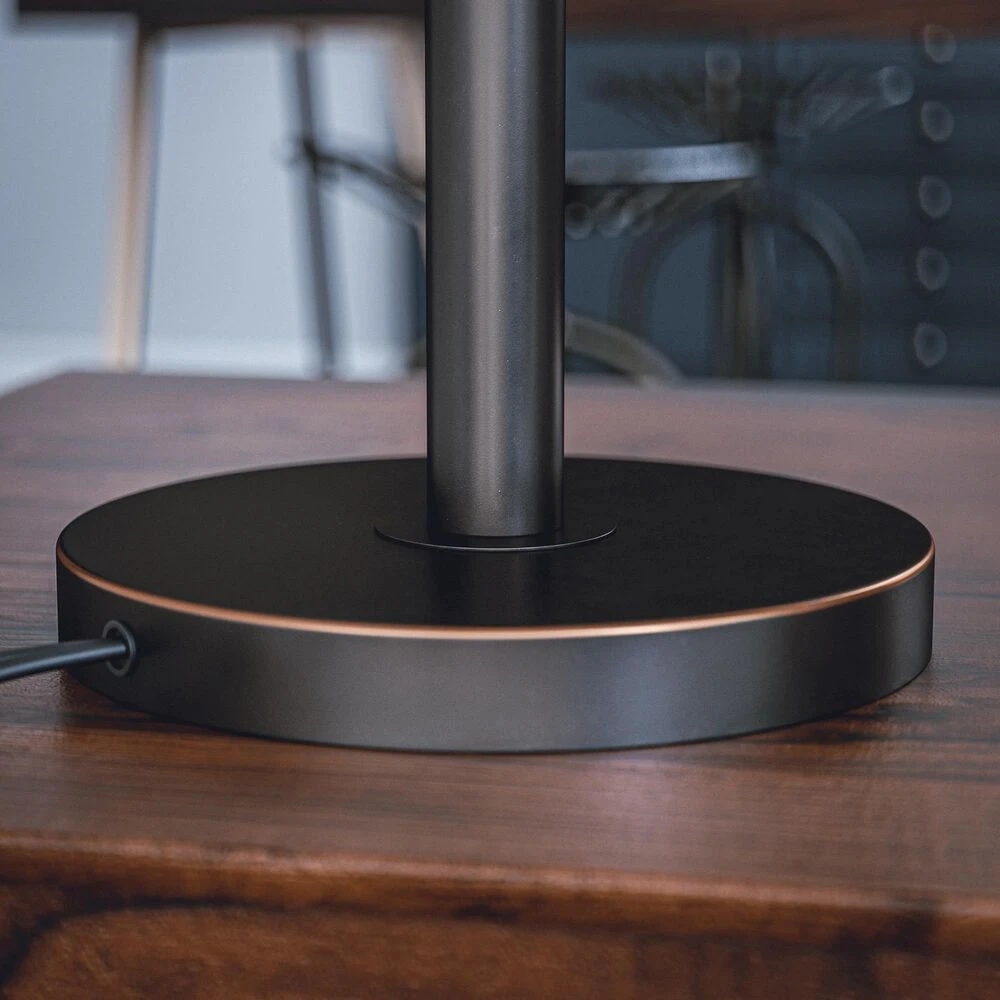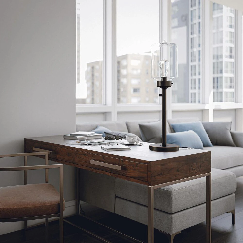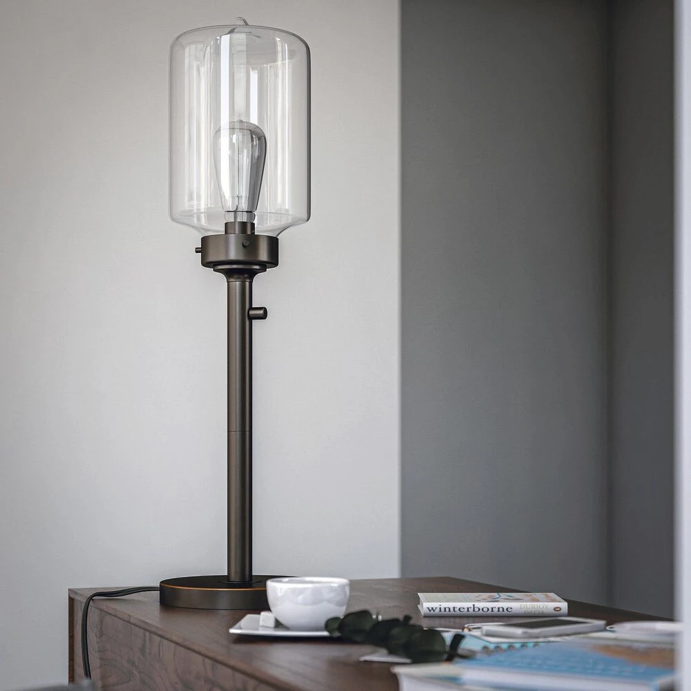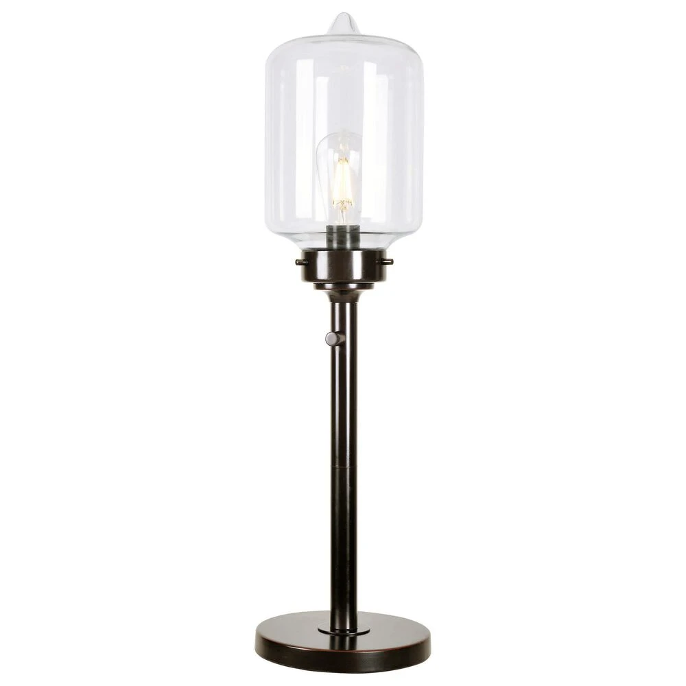The refined and industrial-inspired form of this contemporary table lamp provides a unique blend stripped-down design and elegant craftsmanship. Created using a selective manufacturing process that produces high quality, ultra-refined glass with extreme clarity, this lamp’s sleek glass silhouette is the crown jewel of this high-profile lamp and pendant collection. Further expanding on its industrial-modern theme, oil rubbed bronze finished accents and lamp bodies steer this lamp towards a farmhouse look. Complete the industrial tone by powering the lamp with a warm vintage LED Edison bulb, now included.