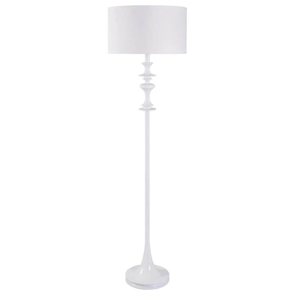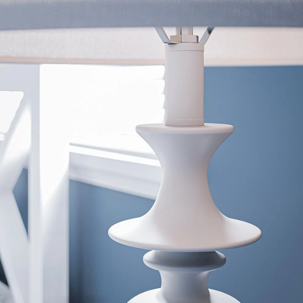French country meets modern design with this cottage chic table lamp. An exaggerated bobeche profile and the glossy white finish add a modern touch to the classically-inspired French Country style. A white drum shade sits atop a white glossy stem for a clean and quaint light source. A perfect accent piece for a cozy living room or bedroom.