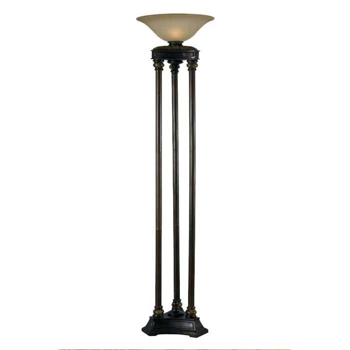 Architecturally satisfying with an attention to classical detailing, these tall, dark, and handsome torchieres are finished in aged tones. A bold use of traditional ornamentation makes this stately floor lamp desired decor.