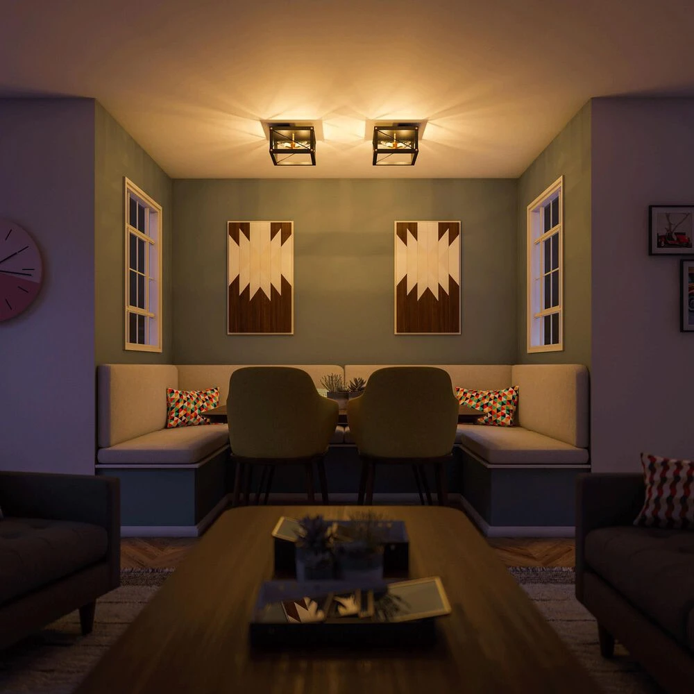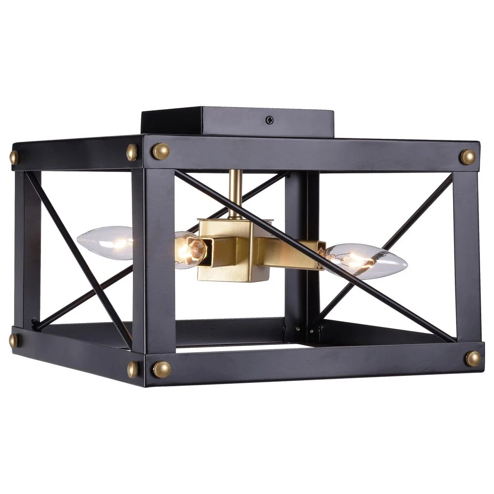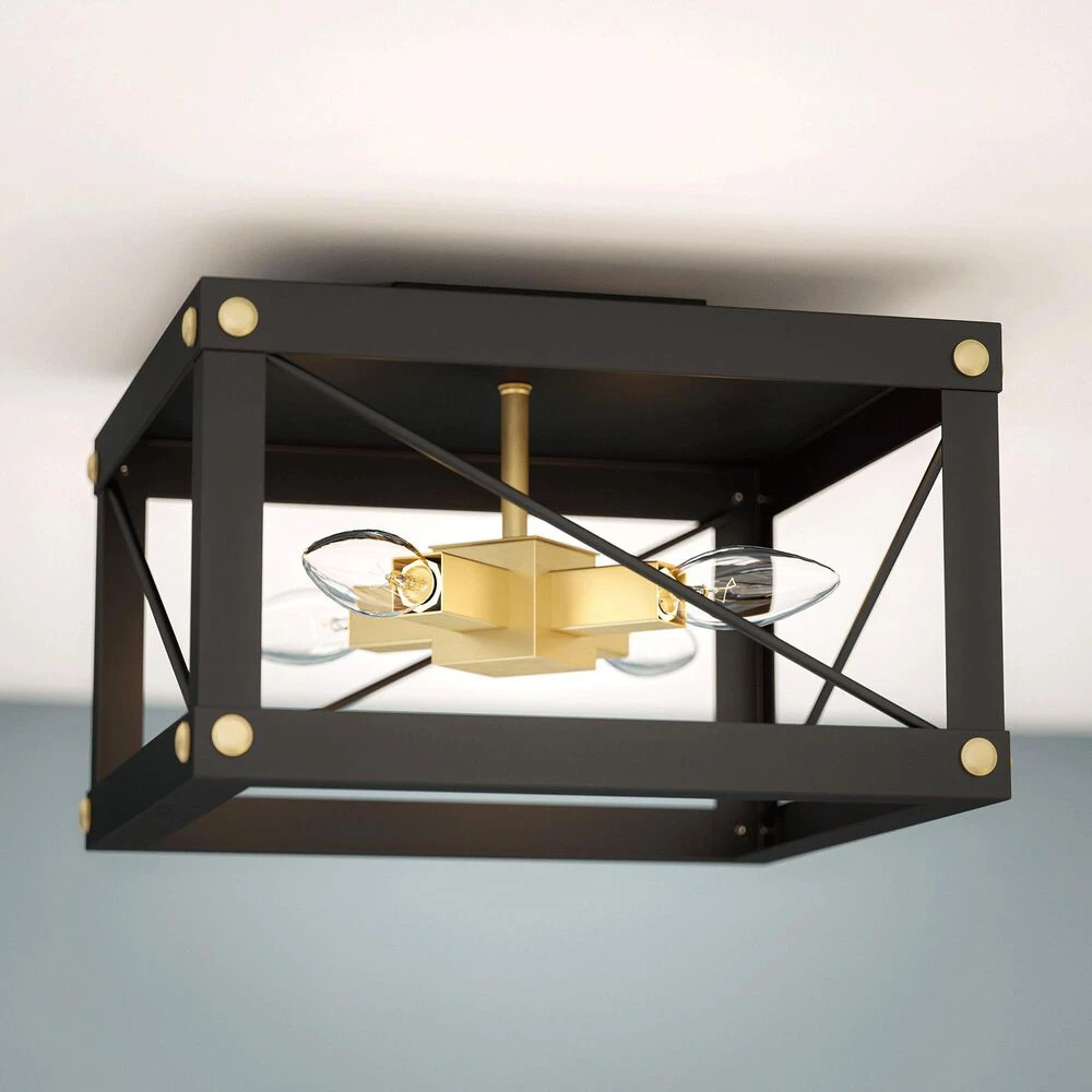 Theres no better way to light up your modern country cottage than with this 4 light flush mount. A rich black finish complements the geometric frame, with shimmering golden accents catching the light escaping from within the frame. Cross brace detailing makes this modern fixture decidedly farmhouse, and when paired with a vintage-style Edison bulb, it complements a wide range of styles from modern farmhouse to urban industrial. Use this flush mount to bring a warm cascade of light to your hallways, entryways, dining rooms, or living rooms.