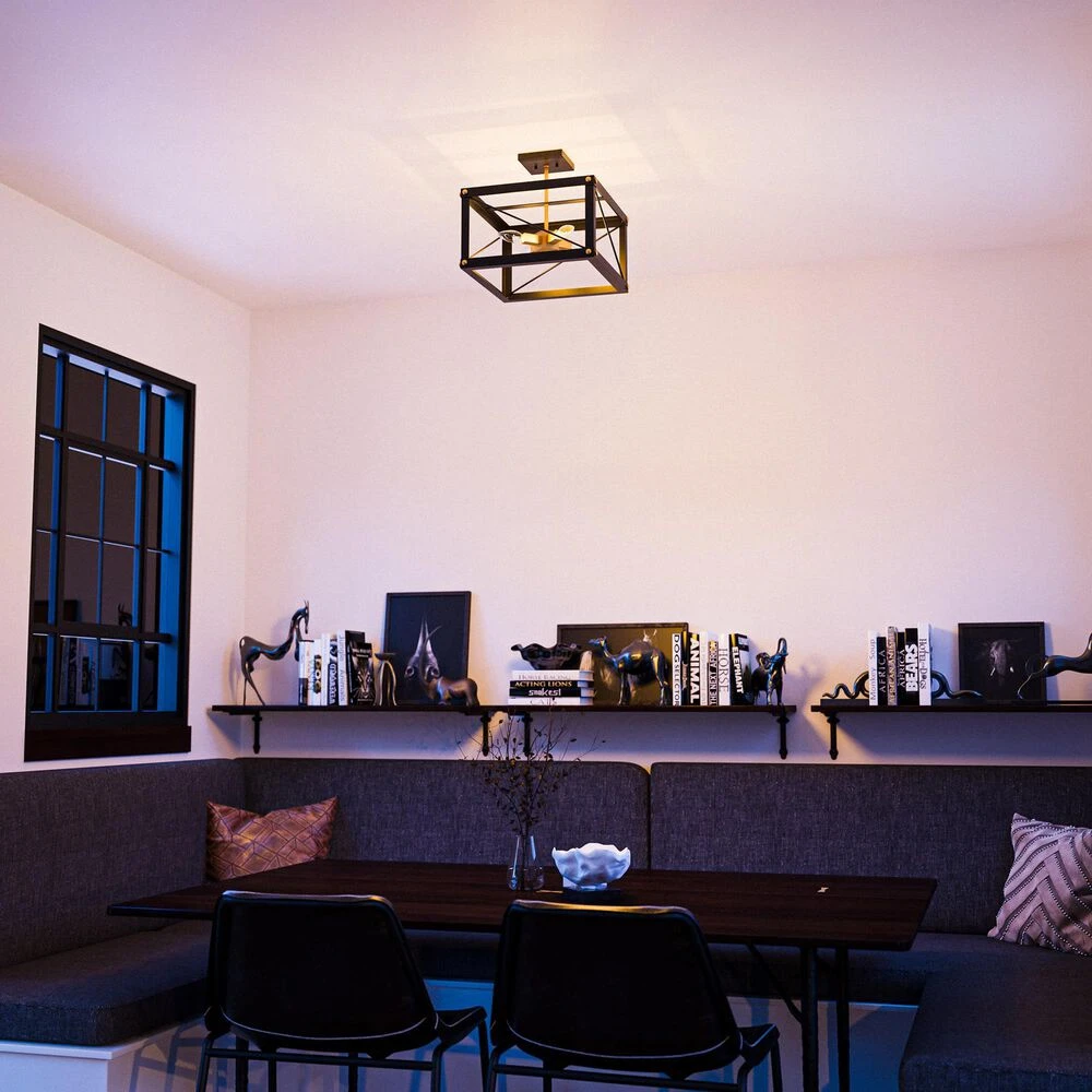 Theres no better way to light up your modern country cottage than with this 4 light semi flush mount. A rich black finish complements the geometric frame, with shimmering golden accents catching the light escaping from within the frame. Cross brace detailing makes this modern fixture decidedly farmhouse, and when paired with a vintage-style Edison bulb, it complements a wide range of styles from modern farmhouse to urban industrial. Use this semi flush mount to bring a warm cascade of light to your hallways, entryways, dining rooms, or living rooms.