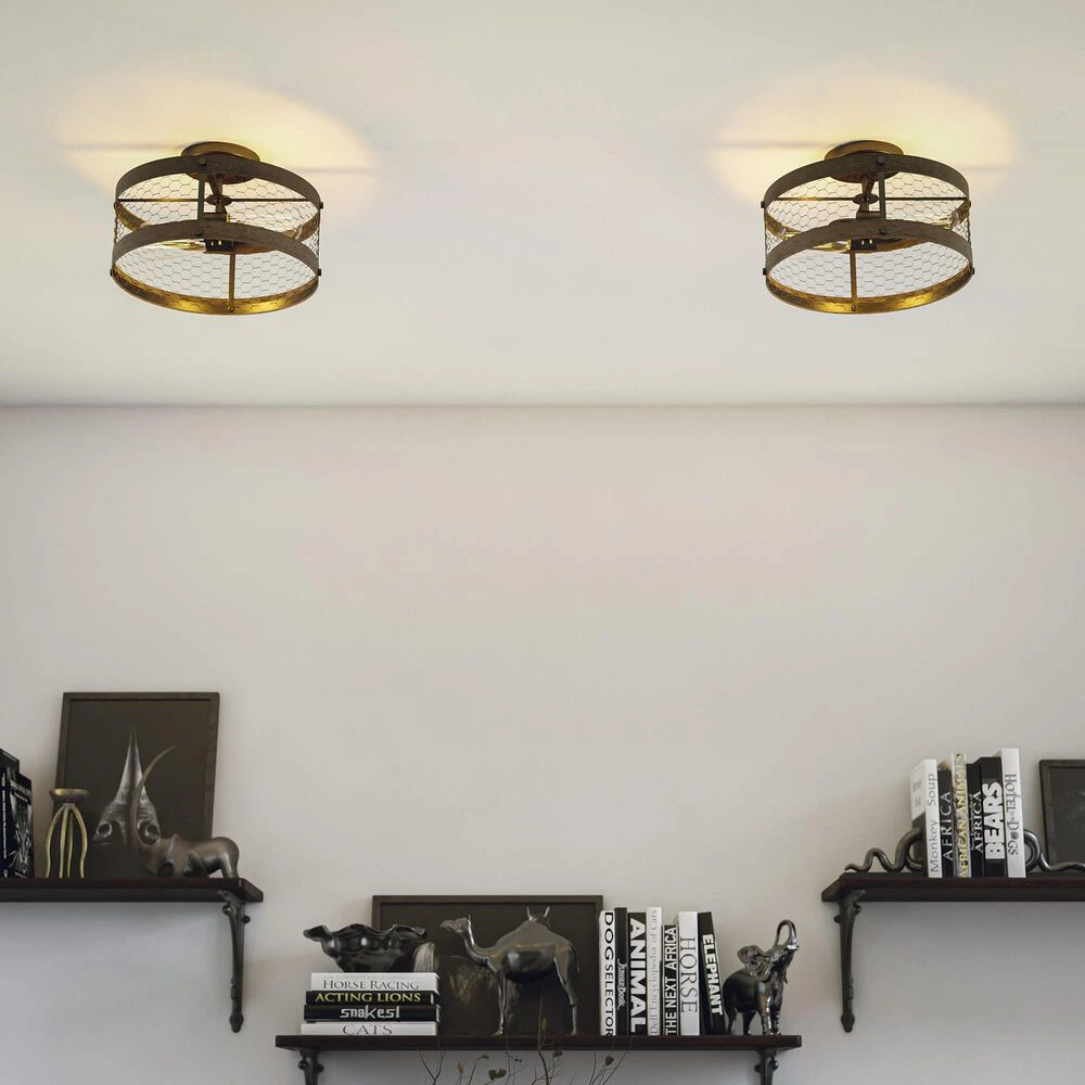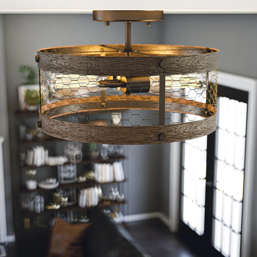 Rustically industrial with a unique open framed body of chicken wire and a sophisticated oil rubbed bronze finish, this modern farmhouse 2 light flush mount drives home the country charm while brightly illuminating your cozy living room.