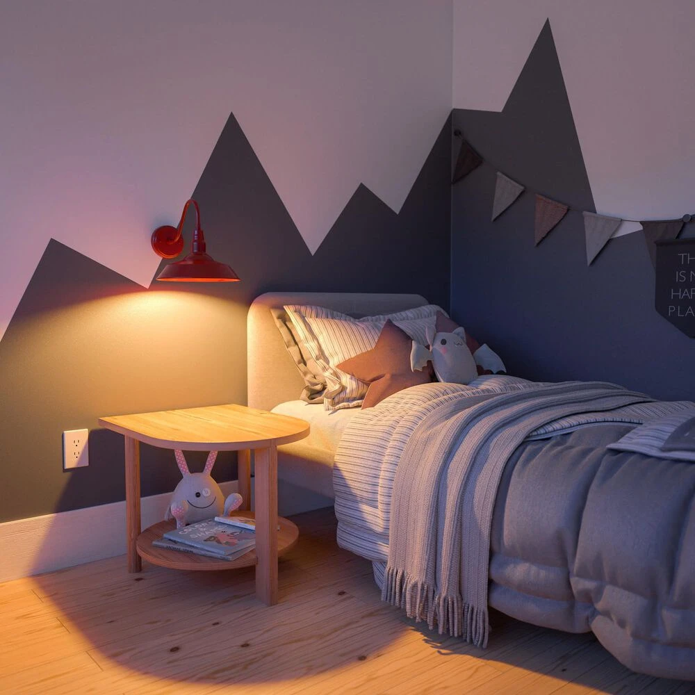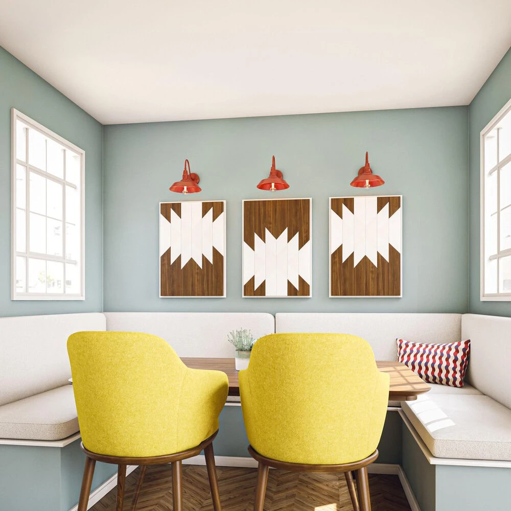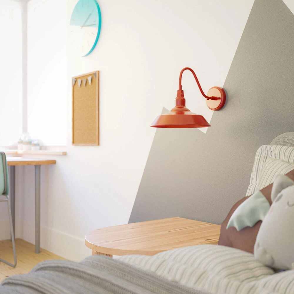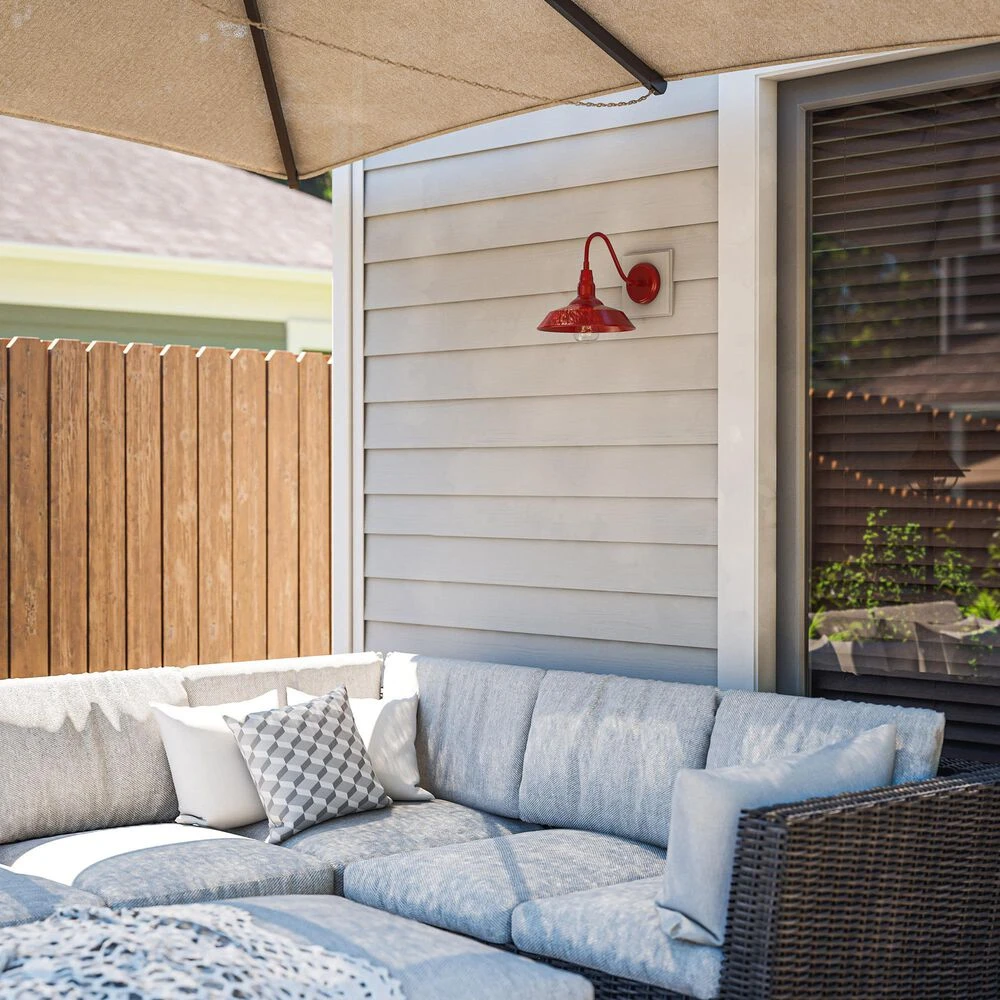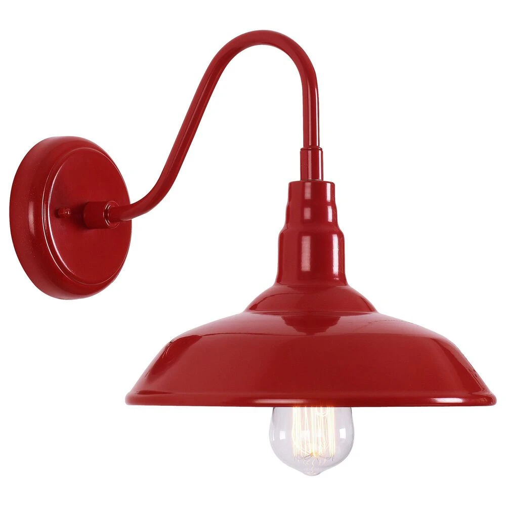 Bring your casual and cozy vintage industrial design style to the great outdoors with this small 1 light outdoor barn light. With its durable fire engine red finished powdercoated steel, this 1 light wall sconce exudes plenty of country farmhouse charm with its wide barn style shade, allowing for plenty of downlighting to illuminate your home address, doorway, entryway, garage, outdoor living room, porch, or outdoor paths. For even more vintage charm, use a compatible Edison bulb to take advantage of the exposed bulb profile of the farmhouse shade. This hardwired wall sconce may also be used indoors.