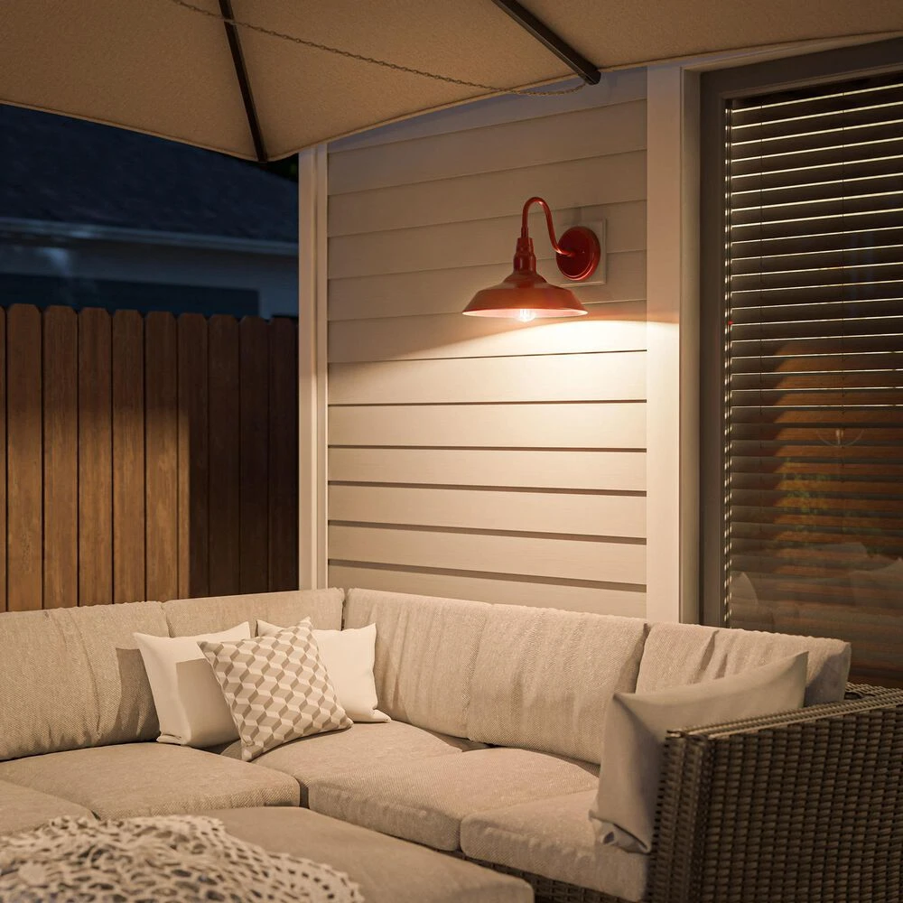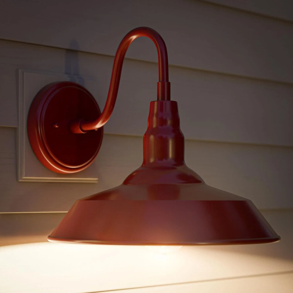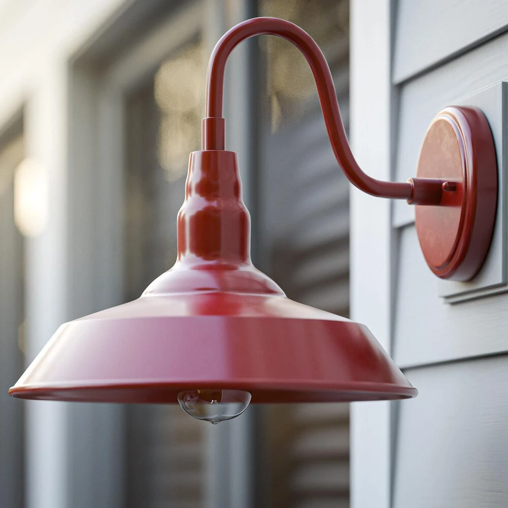 Bring your casual and cozy vintage industrial design style to the great outdoors with this large 1 light outdoor barn light. With its durable fire-engine red finished powdercoated steel, this 1 light wall sconce exudes plenty of country farmhouse charm with its wide barn style shade, allowing for plenty of downlighting to illuminate your home address, doorway, entryway, garage, outdoor living room, porch, or outdoor paths. For even more vintage charm, use a compatible Edison bulb to take advantage of the exposed bulb profile of the farmhouse shade. This hardwired wall sconce may also be used indoors.