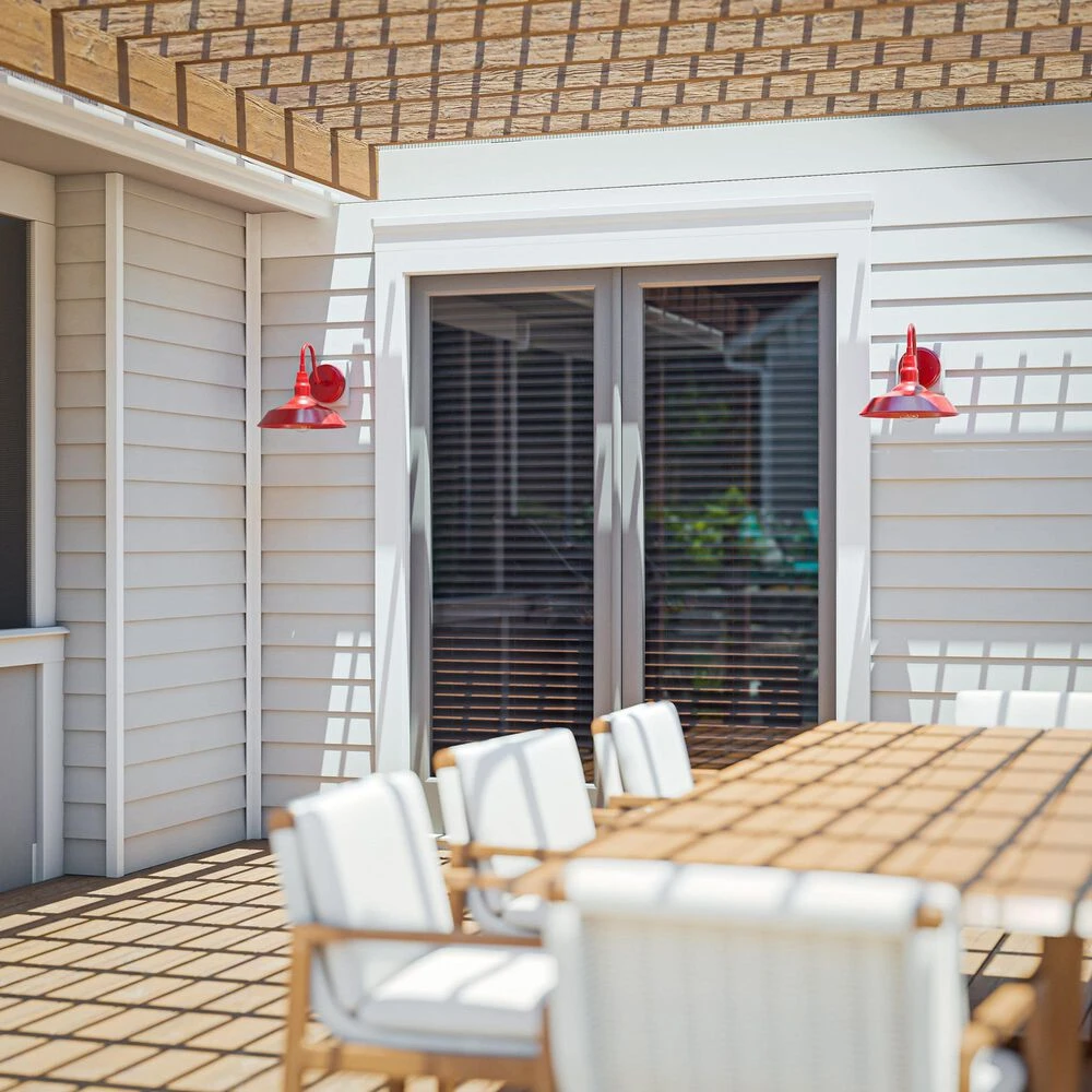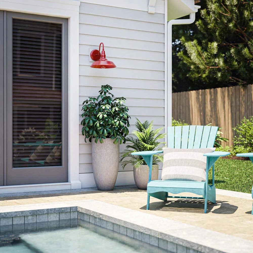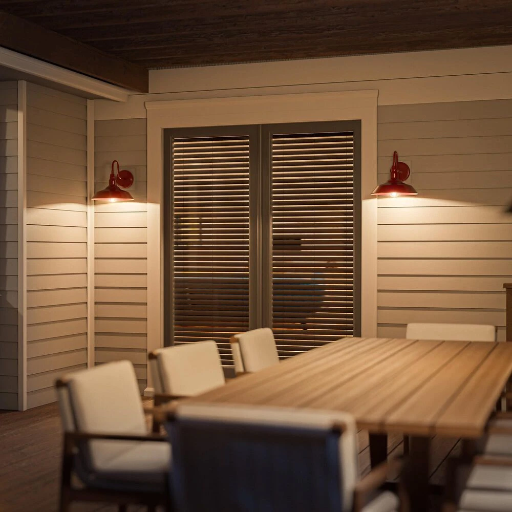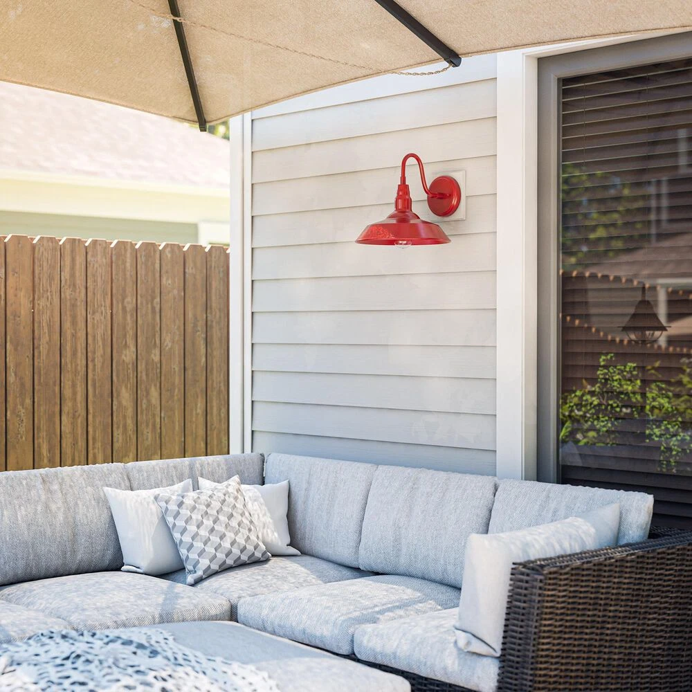 Bring your casual and cozy vintage industrial design style to the great outdoors with this large 1 light outdoor barn light. With its durable fire-engine red finished powdercoated steel, this 1 light wall sconce exudes plenty of country farmhouse charm with its wide barn style shade, allowing for plenty of downlighting to illuminate your home address, doorway, entryway, garage, outdoor living room, porch, or outdoor paths. For even more vintage charm, use a compatible Edison bulb to take advantage of the exposed bulb profile of the farmhouse shade. This hardwired wall sconce may also be used indoors.