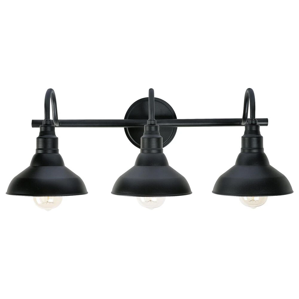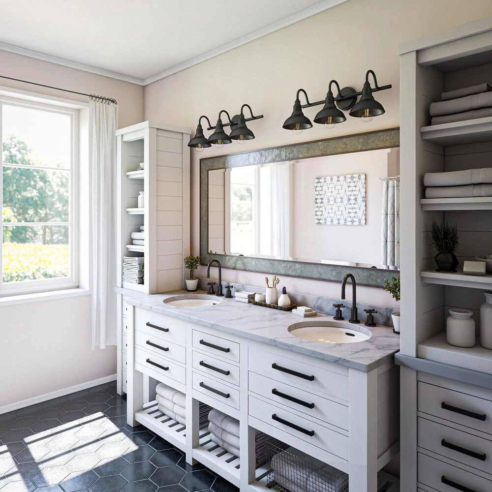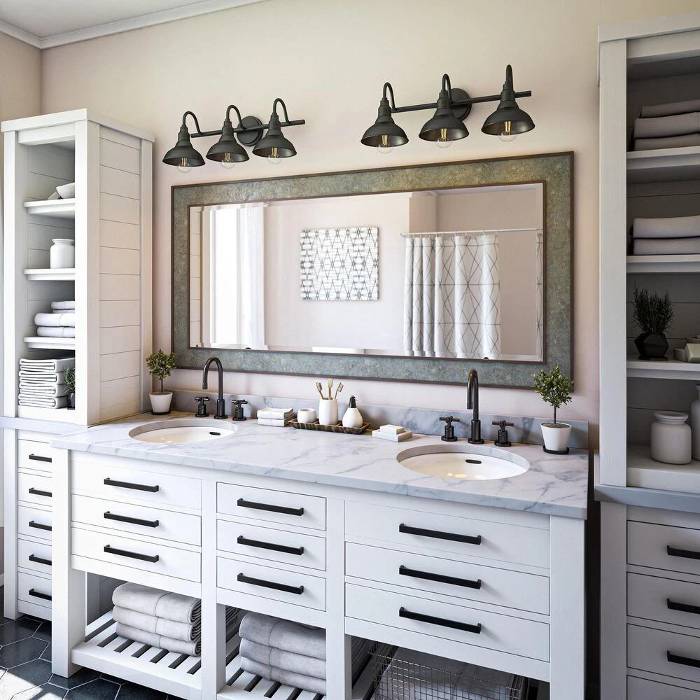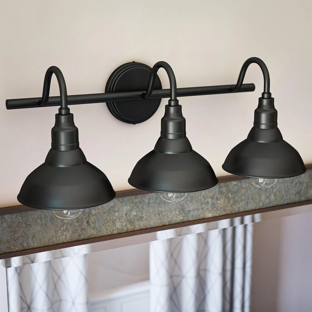 Bring your casual and cozy vintage industrial design style to your master bathroom. With a sleek black finish, this 3 light vanity exudes plenty of country farmhouse charm with the open barn style metal shades, allowing for plenty of downlighting for touching up makeup. For even more vintage charm, use a compatible Edison bulb to take advantage of the exposed bulb profile of these farmhouse shades.