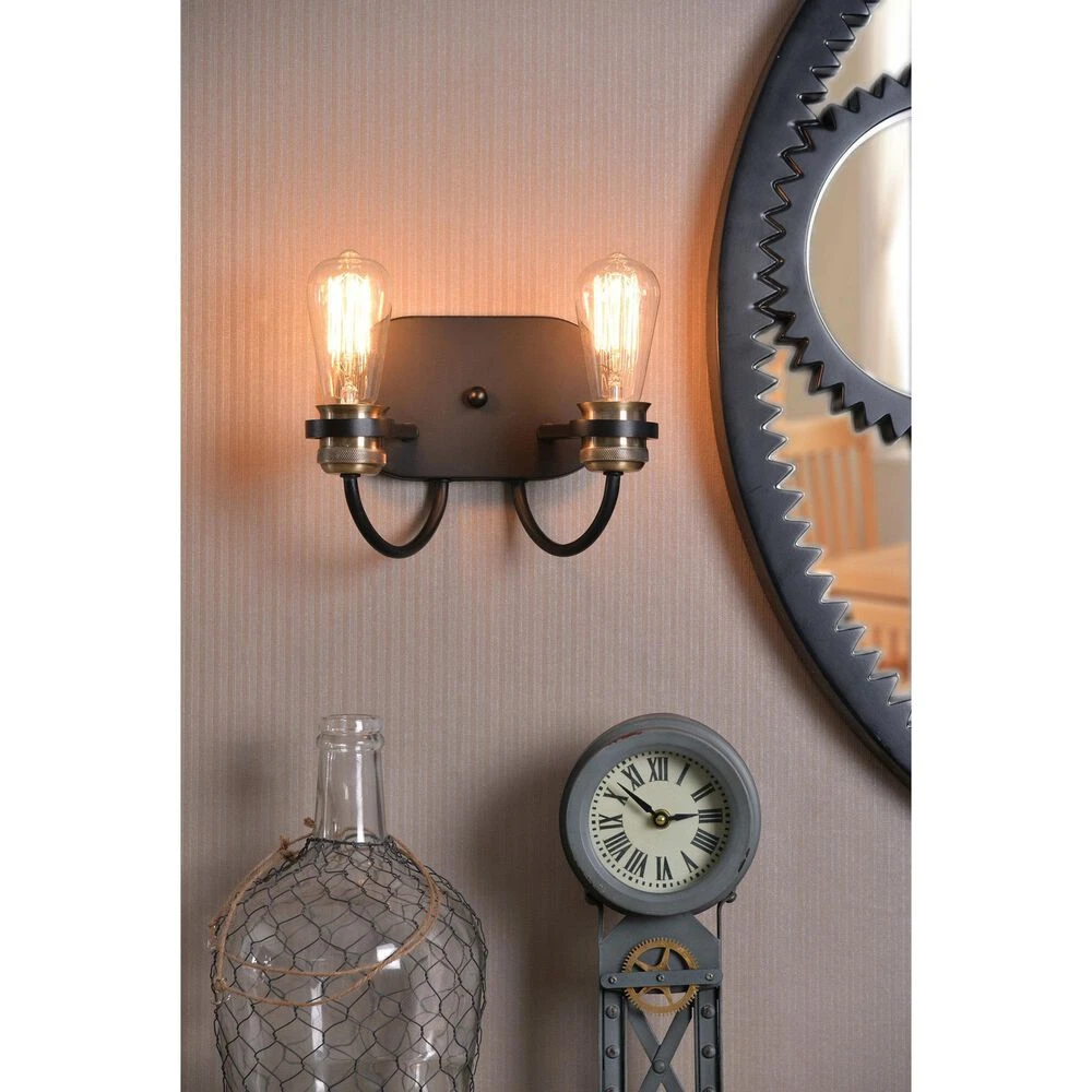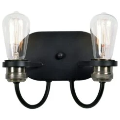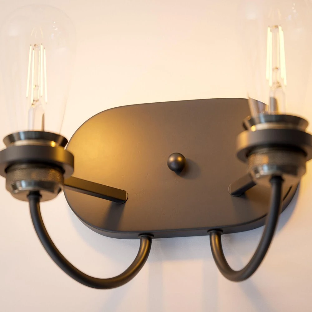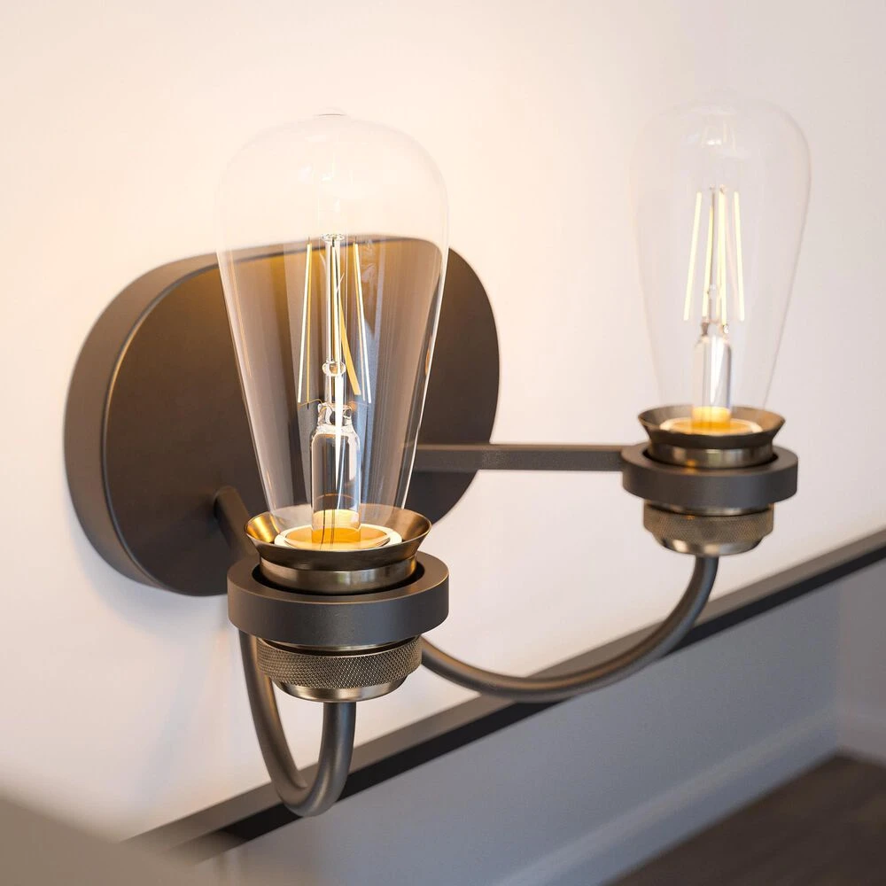 Stylishly unrefined, this edgy industrial sconce’s exposed bulb profile and raw design aesthetic brings sleek urban style to your mixed material living space. The two-tone matte black and antique brass finish creates a standout accent when placed in your industrial doorway. Curved arms support the included vintage-style Edison bulbs. The unfinished look adds edgy urban style to your entryway, hallways, stairwells, and master bedroom, perfect for use in your loft or industrial home. The warm atmospheric glow from the Edison bulbs will ensure that you always have a warm, inviting light to welcome your guests home.
