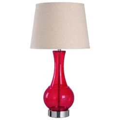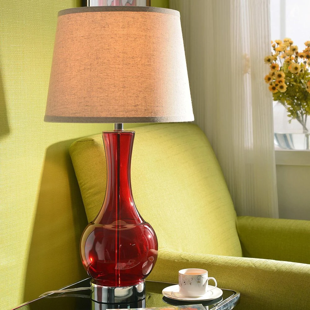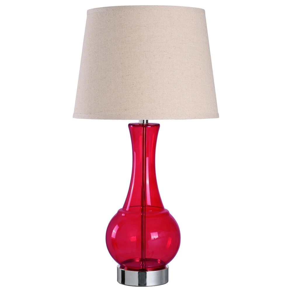 This fiery red table lamp beautifully blends contemporary nuances with a glossy cherry red glass finish to create a sophisticated take on a classic lamp silhouette. The highly reflective deep red glass and brushed steel base catches the bright light escaping from the crisp white shade, creating a shimmering reflective accent on top of your living room end tables. The 3-Way Adjustable lighting ensures that youll always have the perfect amount of light for any situation, whether you need a soft, ambient glow for late night reading, bright, room-filling illumination to light up an after dinner conversation, or something in between.