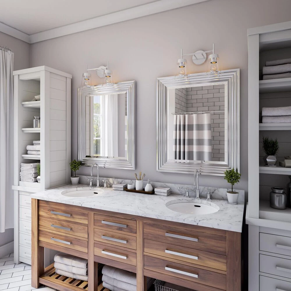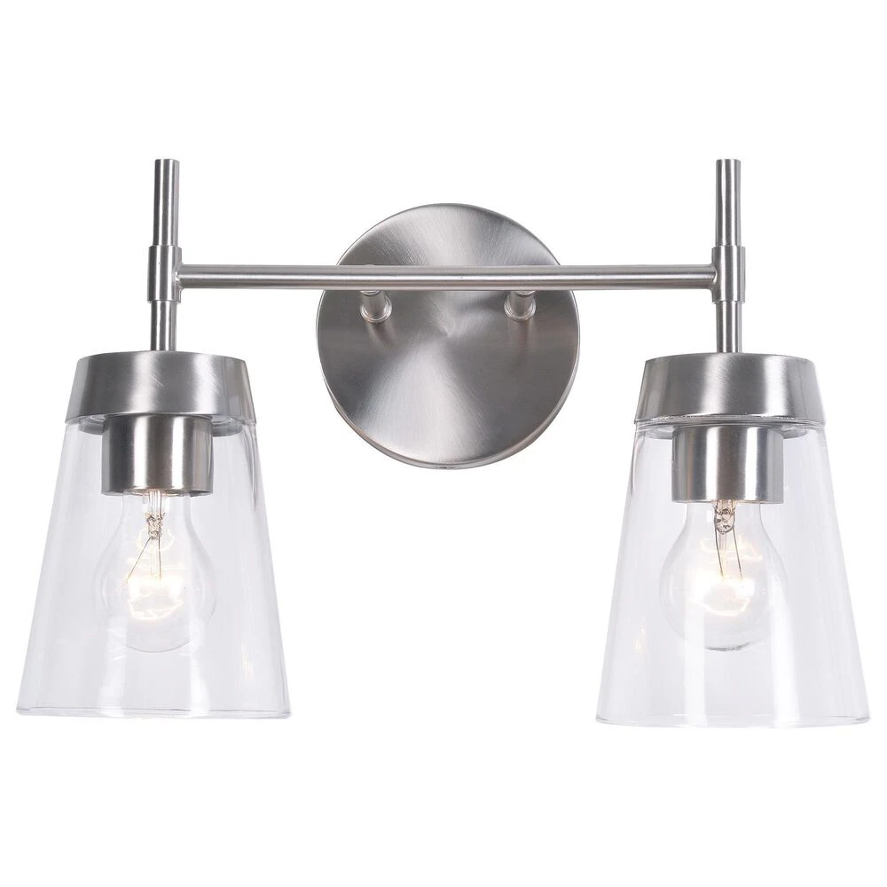 Why not bring your updated Mid-Century Modern style to your bathroom? Sleek, clean-lined design and a lustrous brushed steel defines this 2 light vanity, bringing suave metallic style to your master bathroom. Two ultra-refined clear glass shades give you the option to use vintage-style Edison bulbs to really drive home the retro vibe. Install this vanity light up or down to create the perfect space for you to kickstart your day.