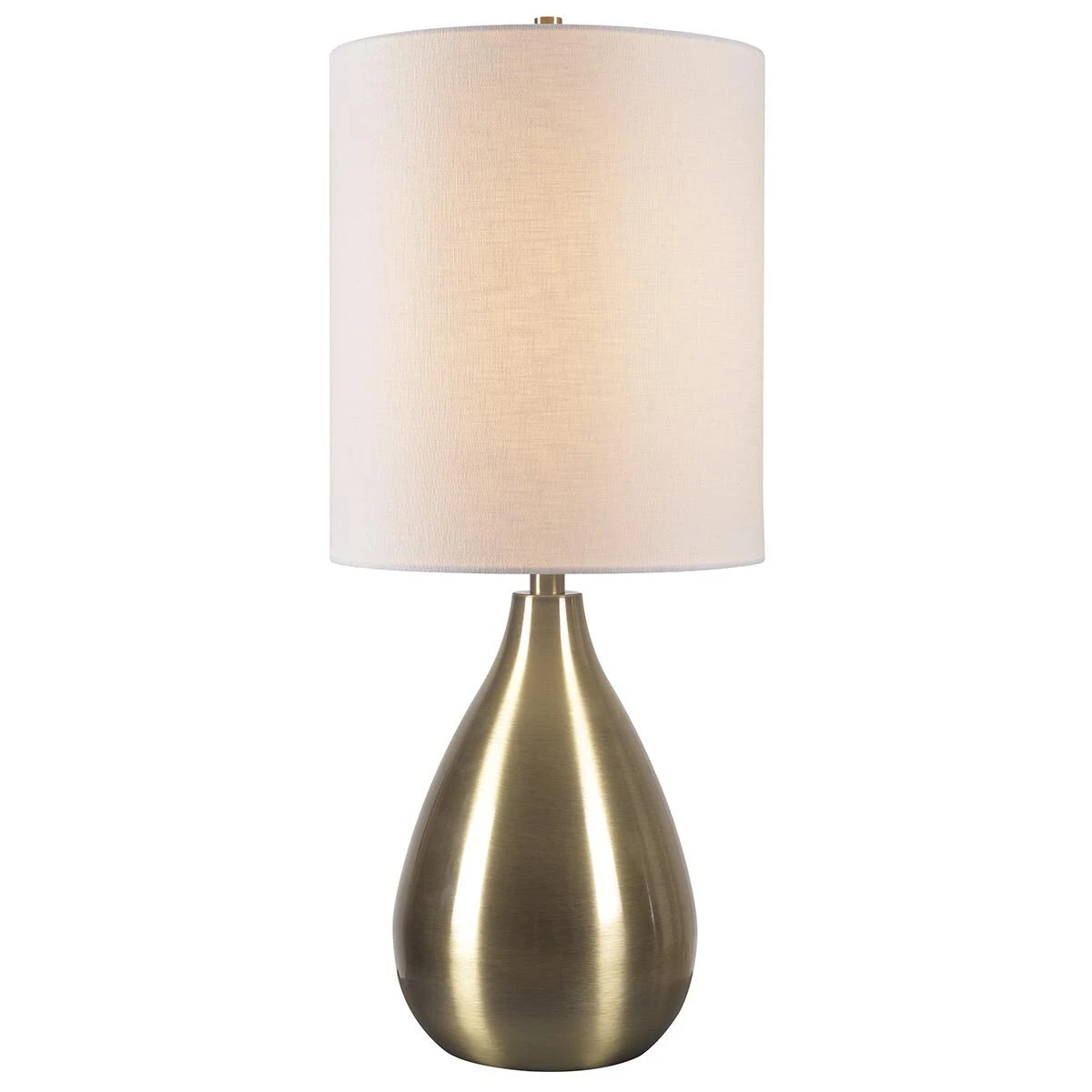 An Impressive Presence With An Artful Silhouette, Droplet Wears Its Antique Brass Finish With A Modern Elegance And Is Topped With A Uniquely Proportioned Tall Cream Drum Shade.
