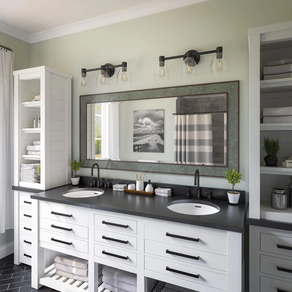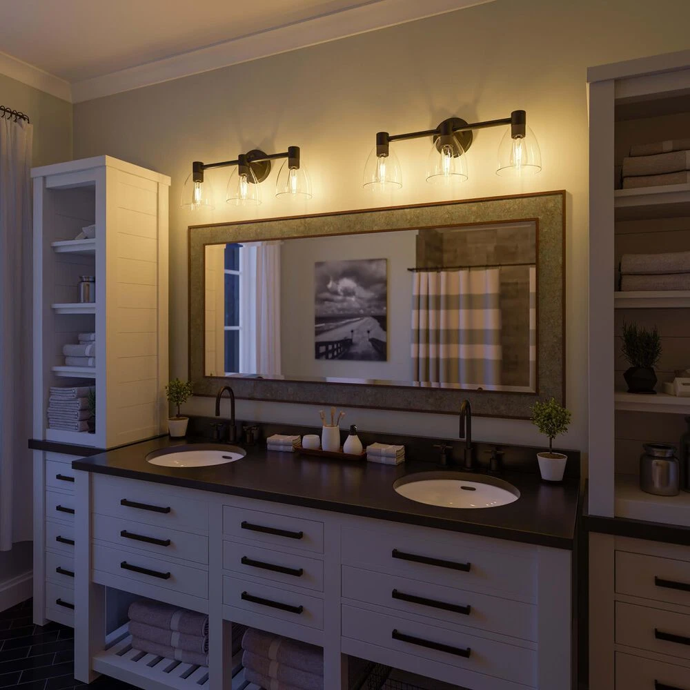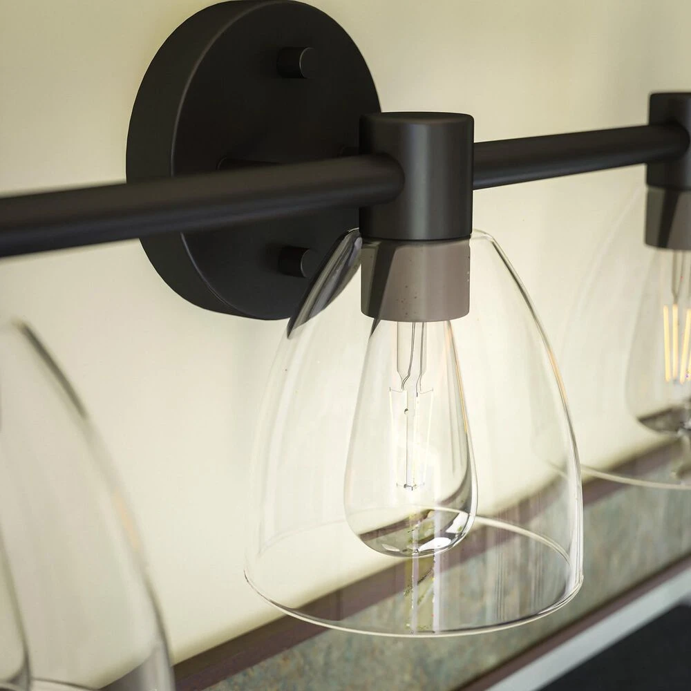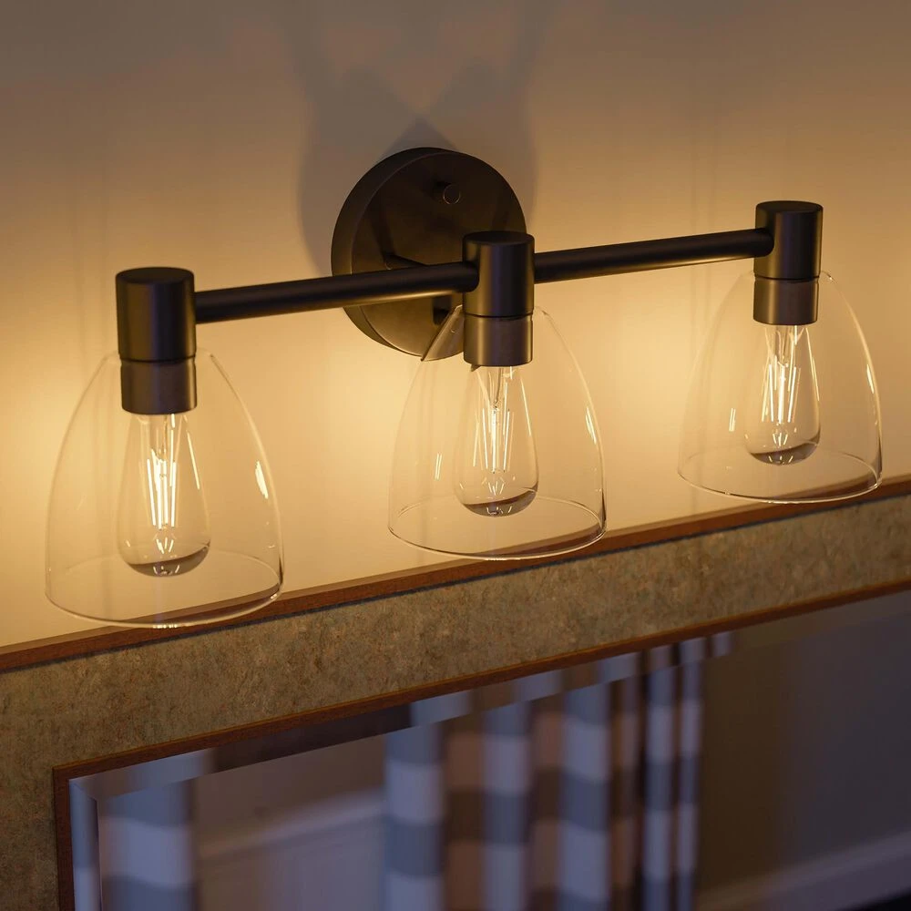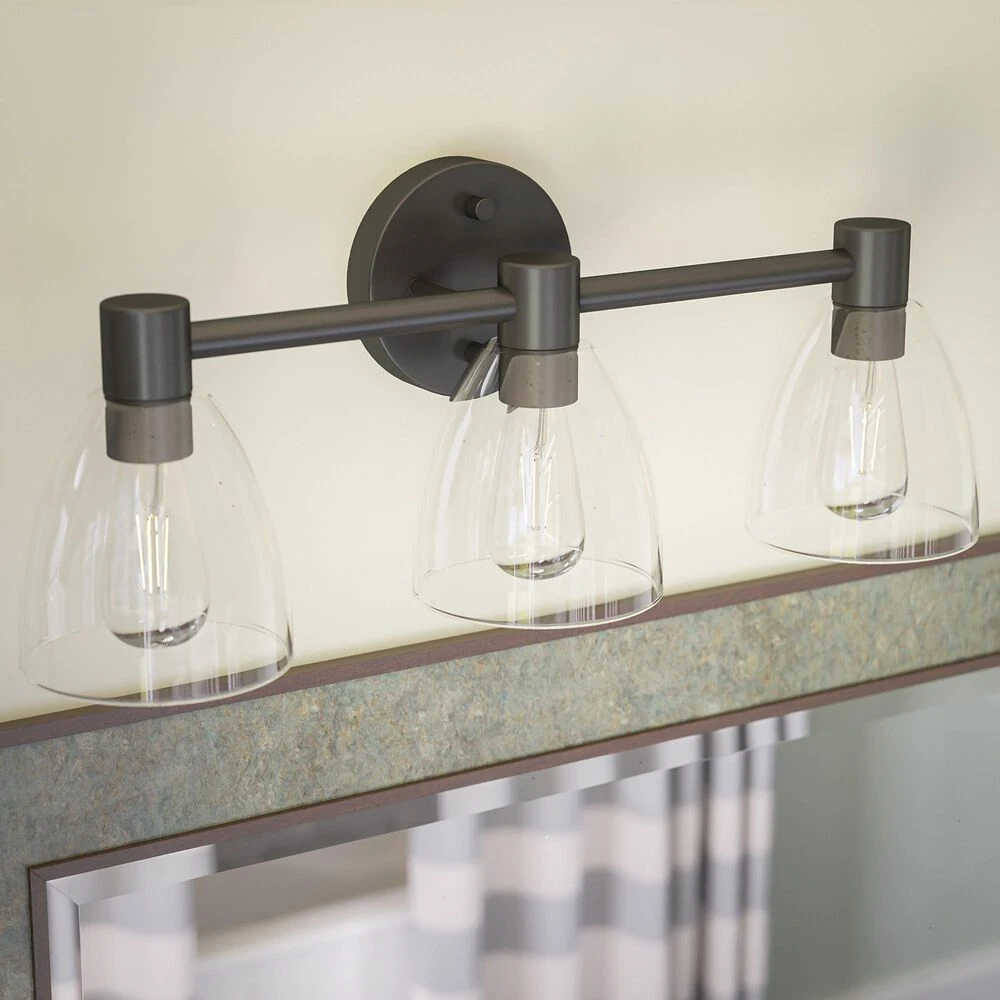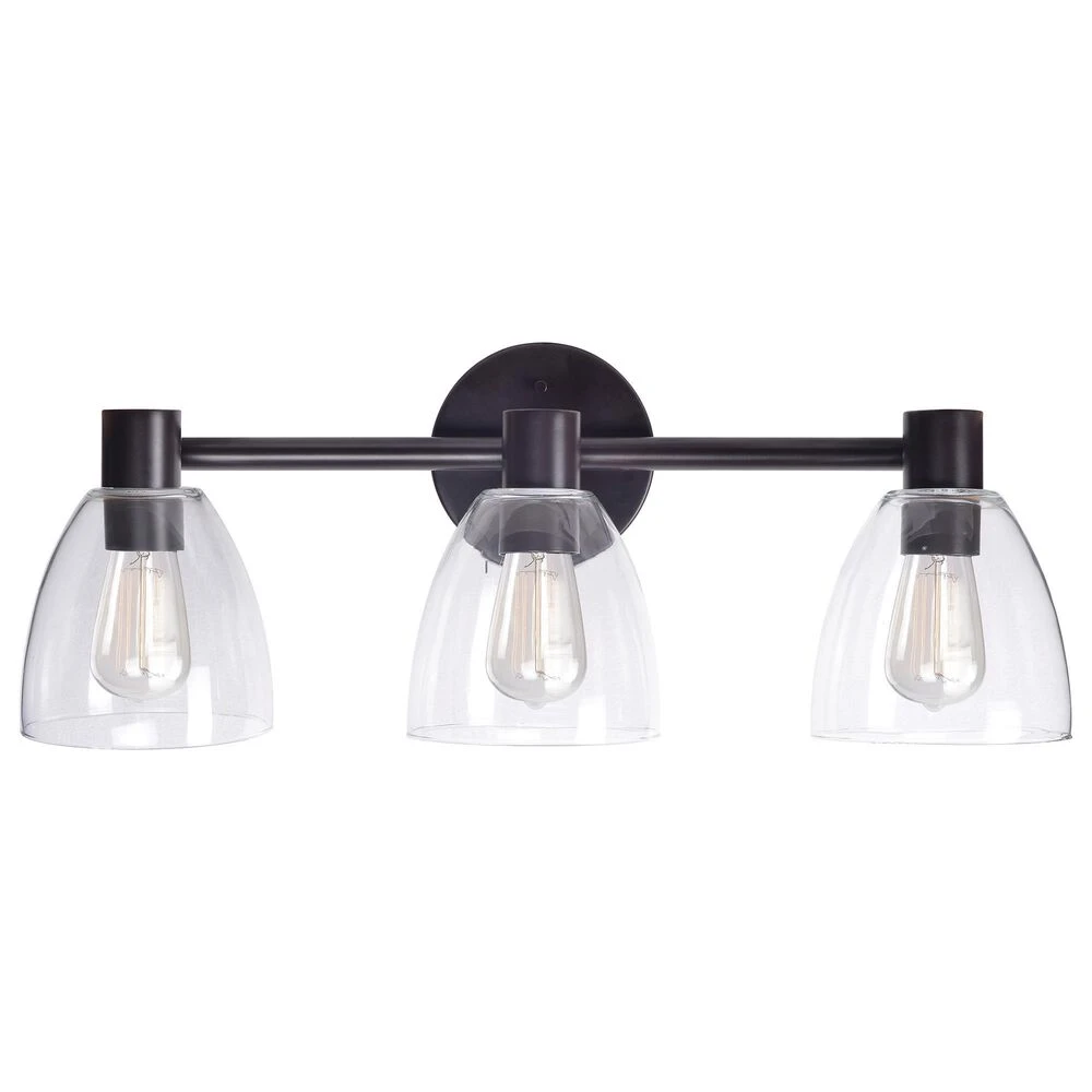 This minimalist vanity light packs a massive amount of style. Harnessing the raw inspiration of industrial design, this versatile fixture provides plenty of bright illumination for you to kickstart your morning routine. This vanity light features three crystal clear glass shades paired with a rich oil rubbed bronze finish, excellent for ramping up the stripped down industrial design notes. This versatile design complements a wide range of home decor, perfect for creating a spa-like industrial farmhouse or modern master bathroom.