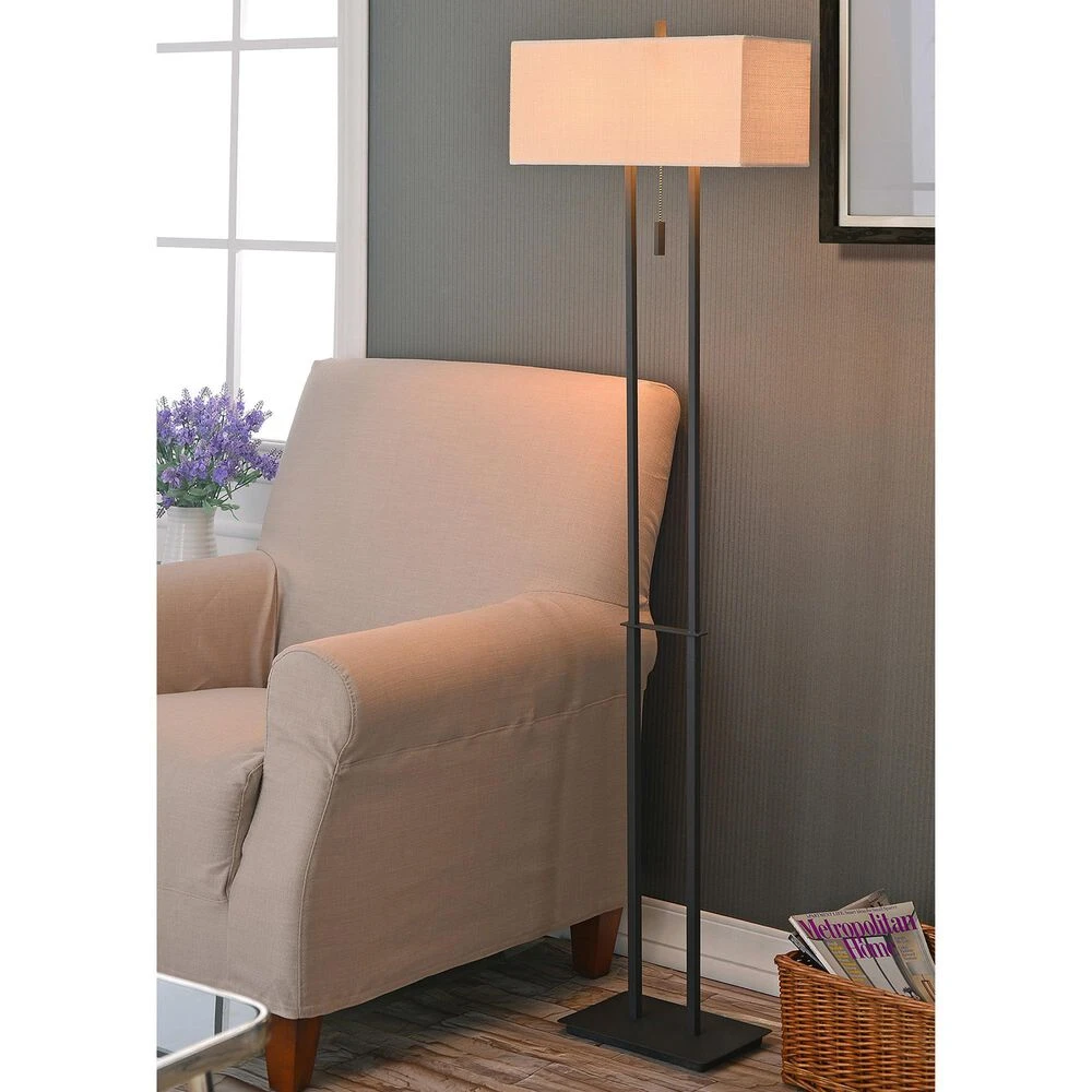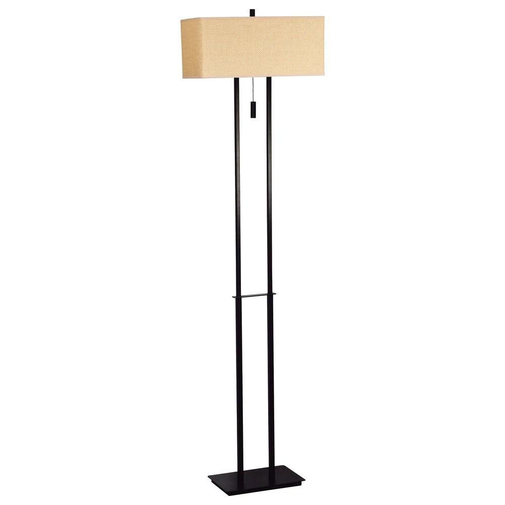 This geometric floor lamp carries distinct notes from prairie style design as the simple boxed frame complements the large overscaled squared shades. Two slender poles finished in a rich bronze make up the center supporting column of this lamp series. Topped with a neutral room pleasing tan textured shade, this floor lamp offers modern shapes and styles without going over the top. Each lamp is outfitted with dual on/off pull chains for easy operation.