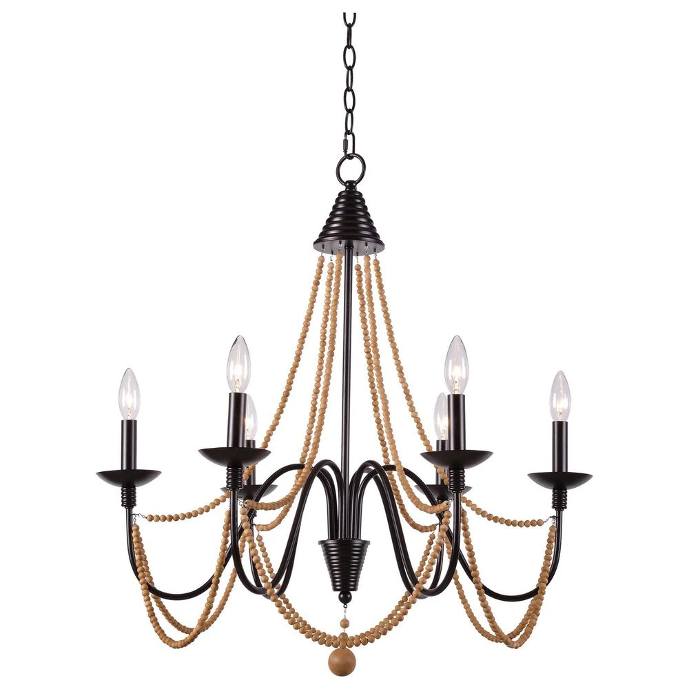 This 6 light chandelier brings an easy elegance to any space, whether its hung over a modern eating area or in a bohemian entry way. The body of the chandelier is comprised of draping rods that bend and curve gently into shape with light toned wooden beads that add a touch of fun to the fixture. An oil rubbed bronze finish covers the chandelier with each light being cradled by a candle-esque holder at different areas across the body. The chandelier, with its graceful arches and lines, would be perfect for a bohemian-inspired space that needs a centerpiece. Paired with a neutral-toned space, this chandelier will pull a space together and provide a finishing touch of charm. At 27-inches tall, the 6 light chandelier is sure to add an interesting spark to your space!