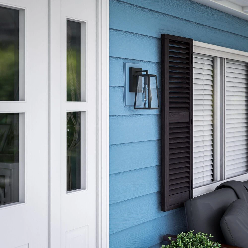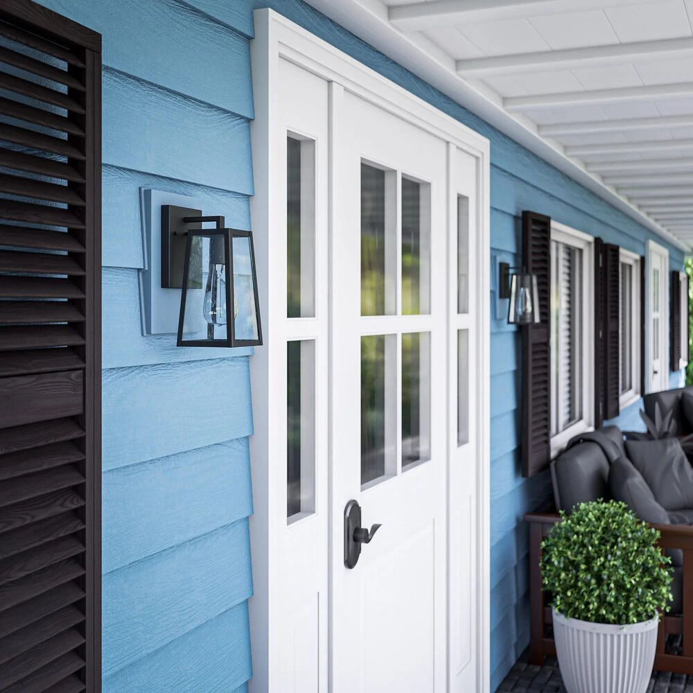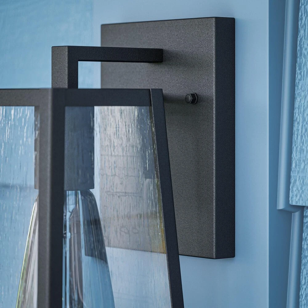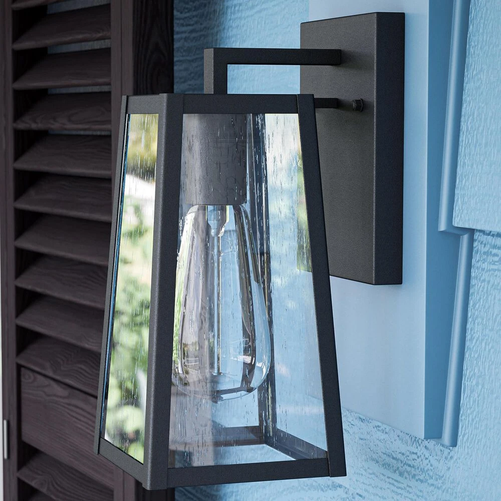 Make a subtle statement with this simplistic, yet stylish modern wall lantern. Perfect for use outdoors to illuminate your entryway, this geometric beauty shows that simple, minimalist design can make a statement all its own. Clear seeded glass shades and a warm black finished powder coated steel add a hint of texture to the otherwise clean-lined piece, allowing the bright light of the bulb to flow unrestricted to welcome your guests to your charmingly contemporary home with a warm cascade of light.