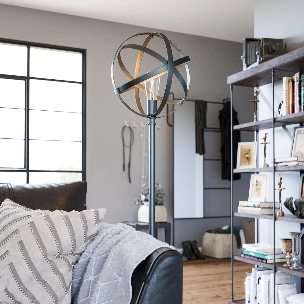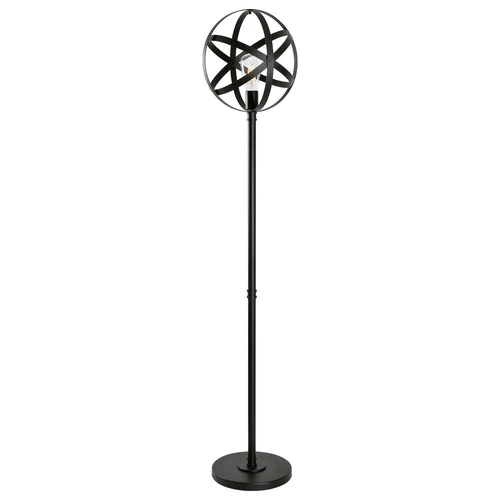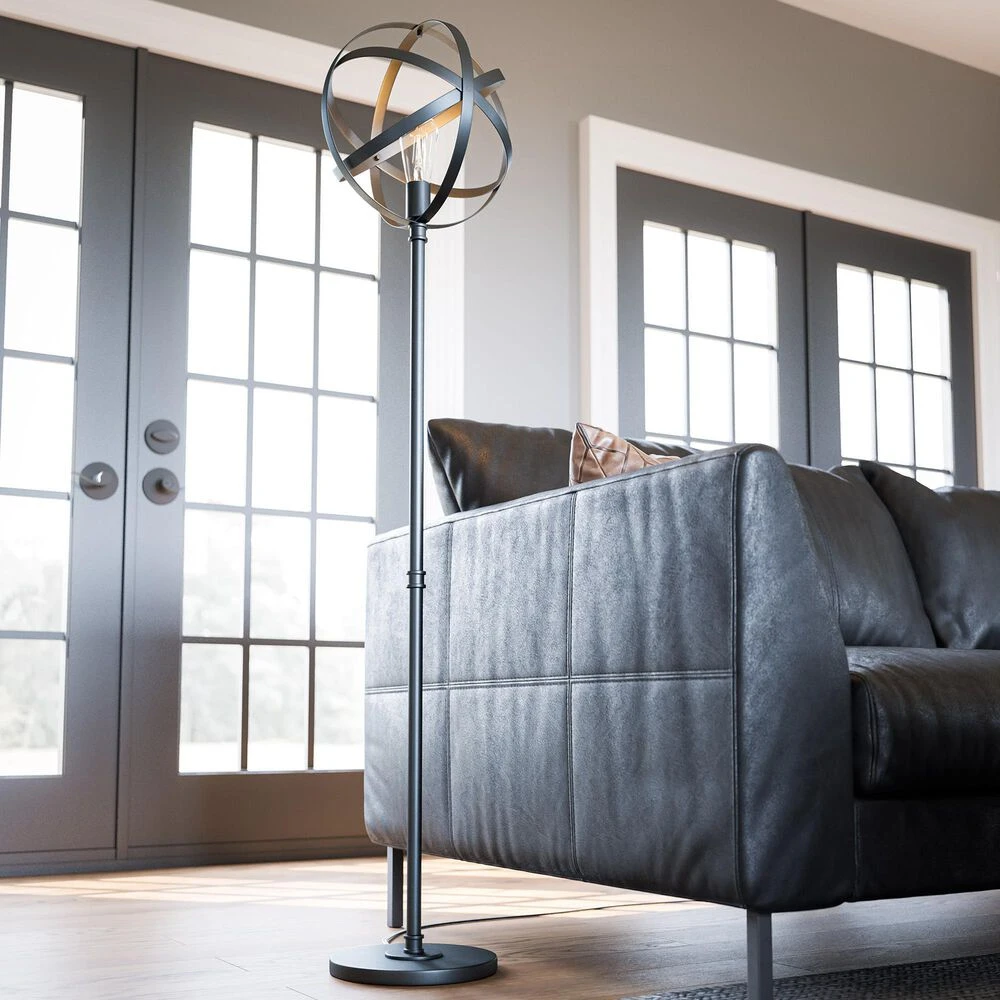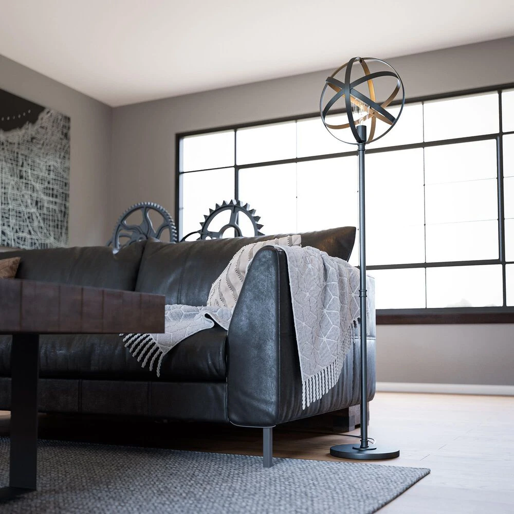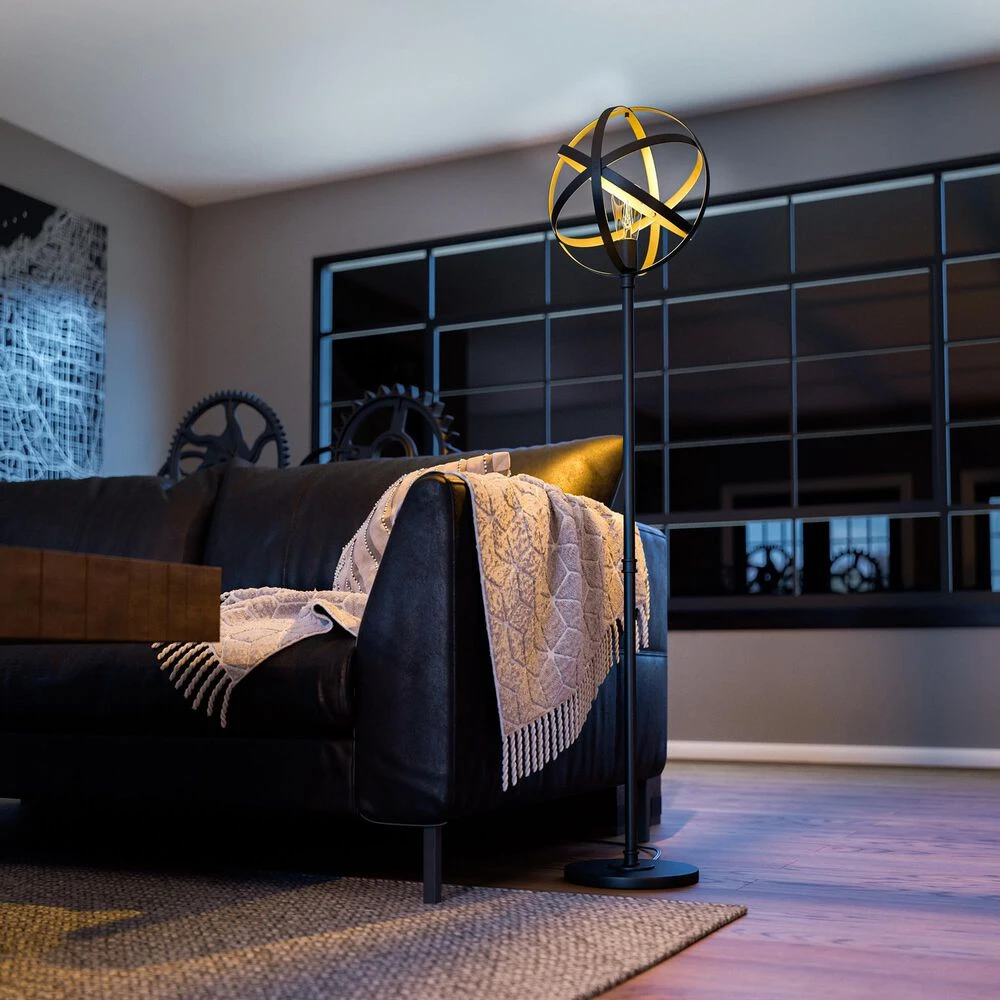 Industrial and gothic tones blend to create this unique and mechanically inspired lighting series. Finished in a rich matte black metal, this floor lamp features an atomic era design structure that crisscrosses and weaves to surround a decorative Edison bulb. Whether your design style is industrial urban loft or countryside farmhouse, this unique open spherical lighting family is the perfect representative for either style configuration.