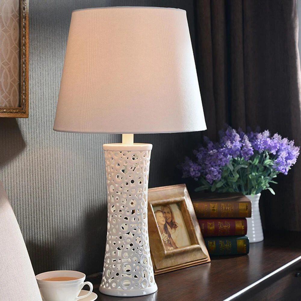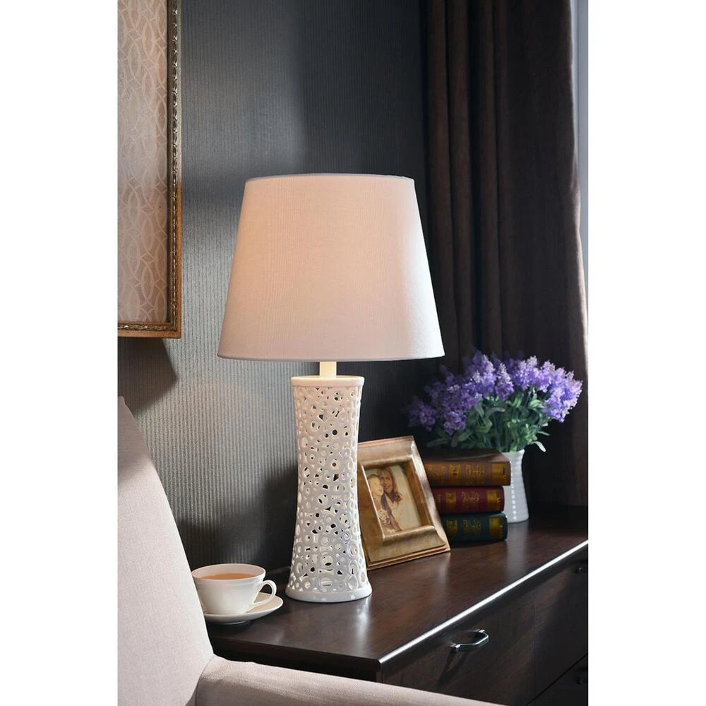 Modern with a touch of whimsy, the Glover Collection allows your playful personality to shine through in the form of an elegant table lamp. The glossy white ceramic adds a sense of refinement to your dark wood end tables, while fun circular cutouts create a fun, unique aesthetic. The Glover has three adjustable light levels so you can control the atmosphere in your contemporary living room.
