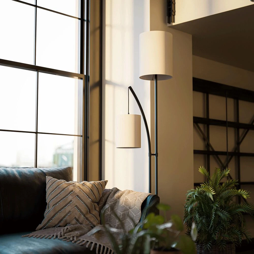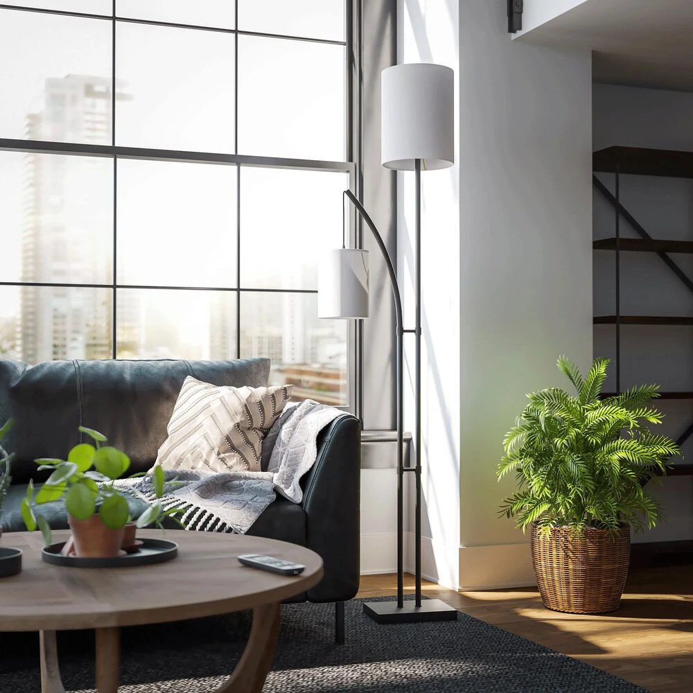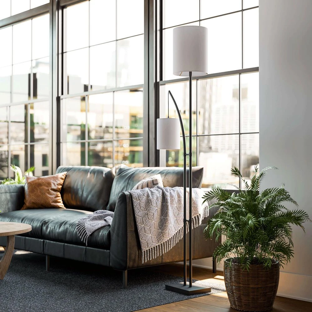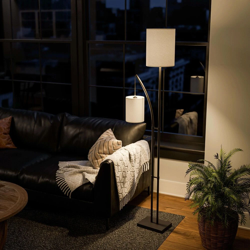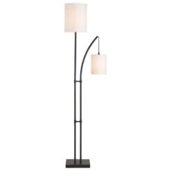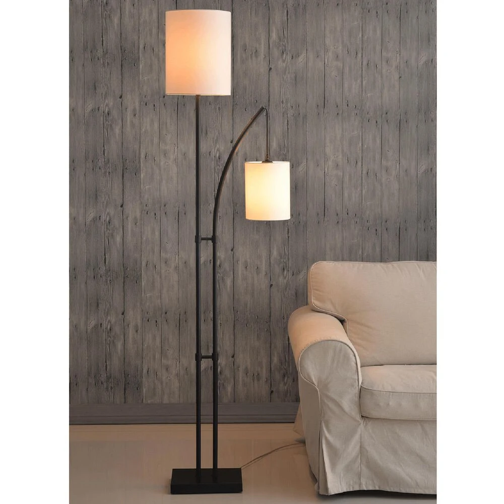 Tall and elegant, this towering floor lamp includes a bonus light suspended from a lightly curved arm thats perfect for use as a reading light. The body is finished in a rich bronze that contrasts with the two crisp white drum shades. A convenient foot switch allows you to quickly and easily turn on your new floor lamp, illuminating your casual urban loft living room.