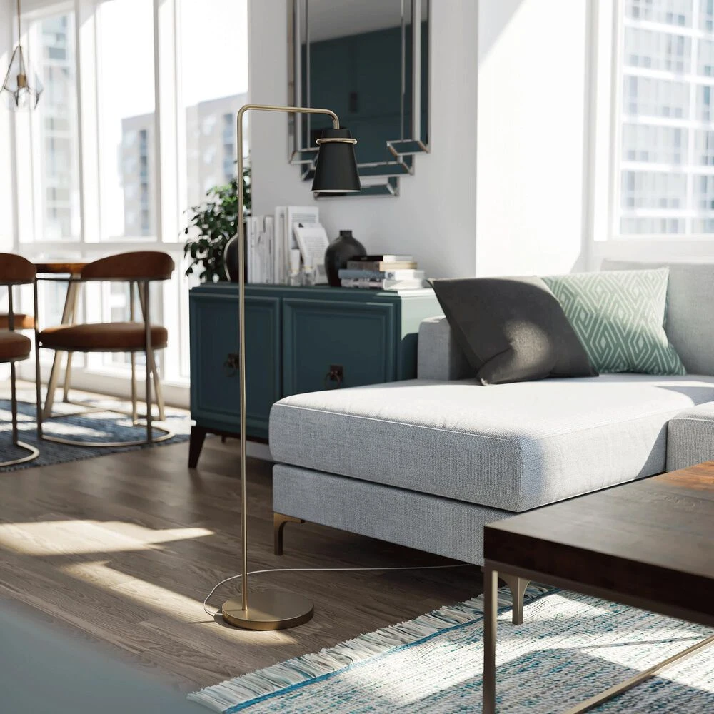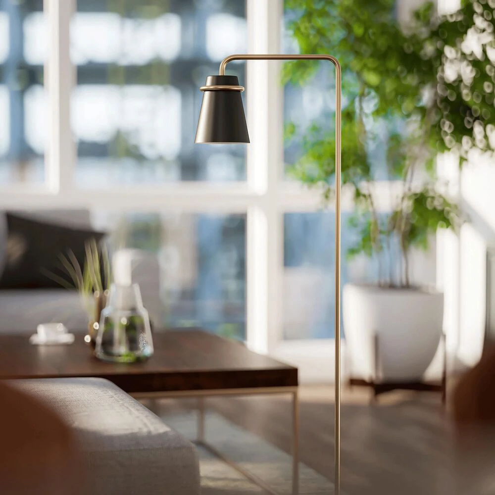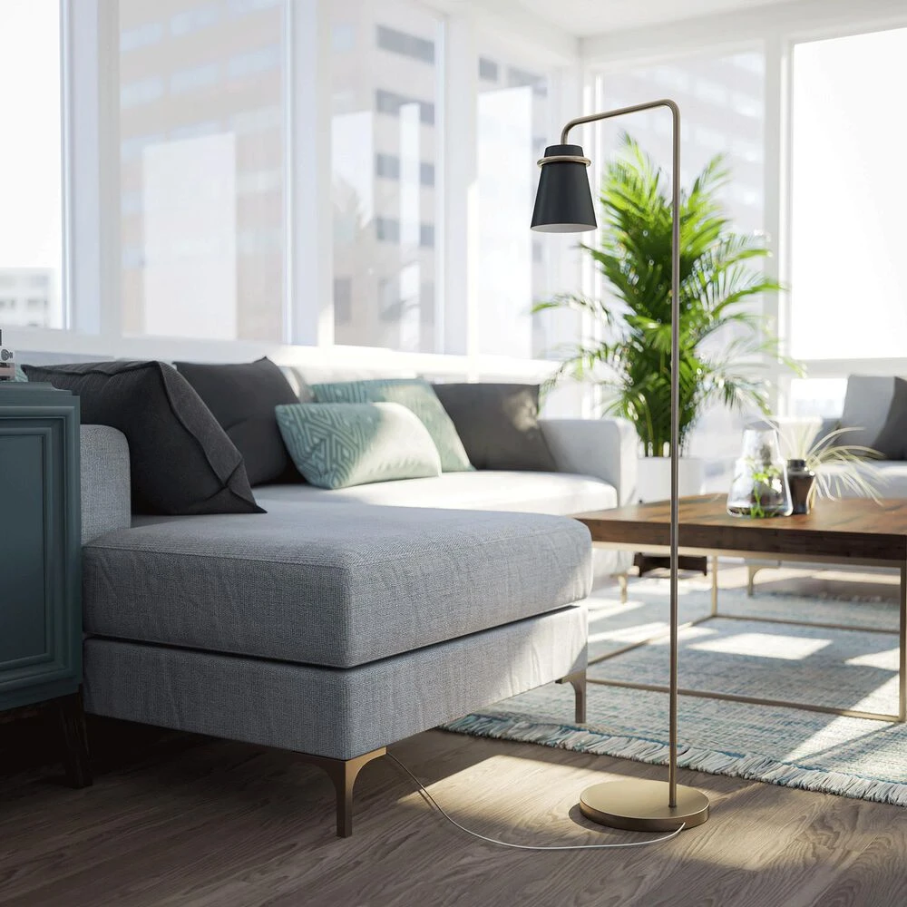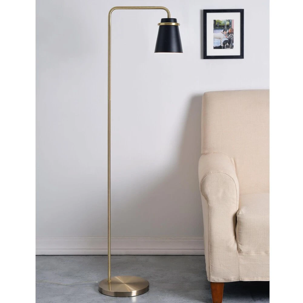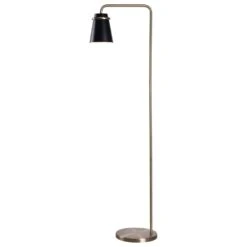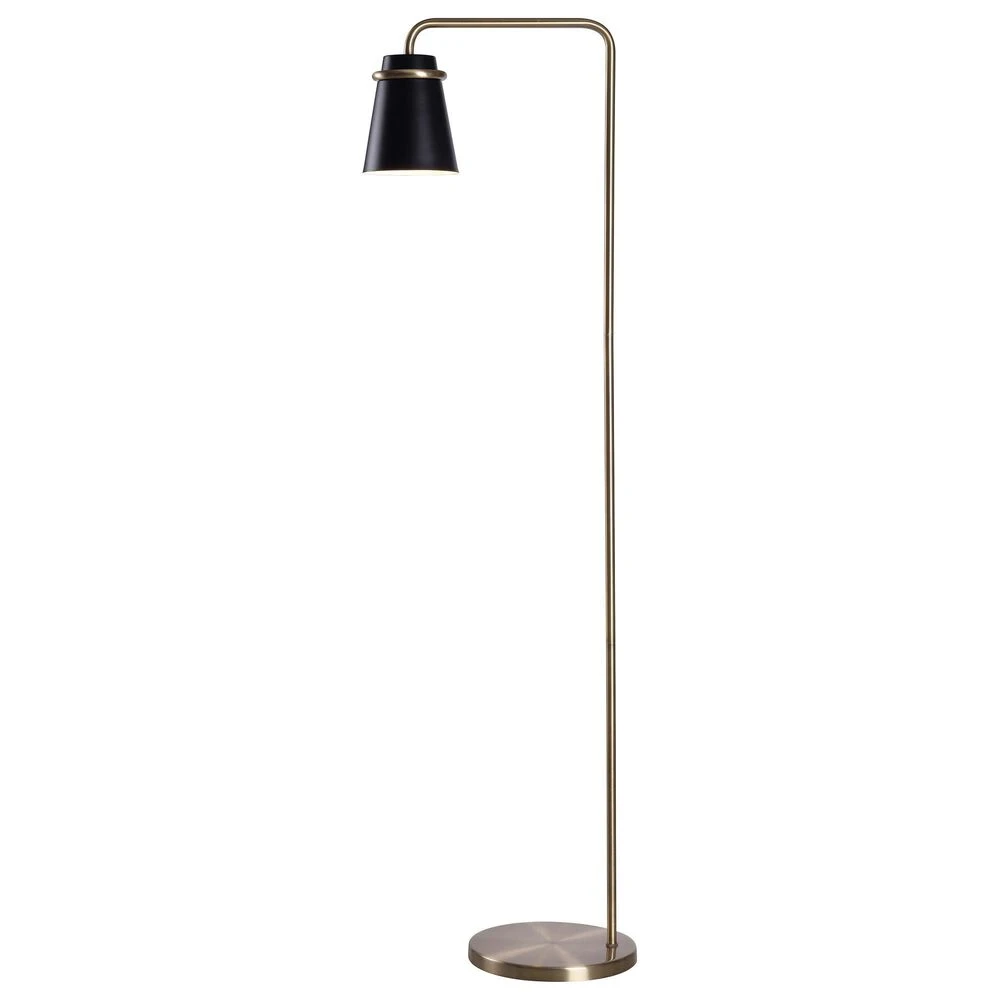 Taking refinement to the next level, this floor lamp features a sleek circular base that leads into a support rod that comes in a rich antique brass finish. A matte black metal conical shade faces downwards from the right arm, sporting a brushed steel ring around the top. Sleek lines make up this floor lamp, delivering a unique task light. Place next to your home office desk or cozy accent chair. Youll be able to focus on working on your projects or just enjoy some downtime on the computer with plenty of illumination.
