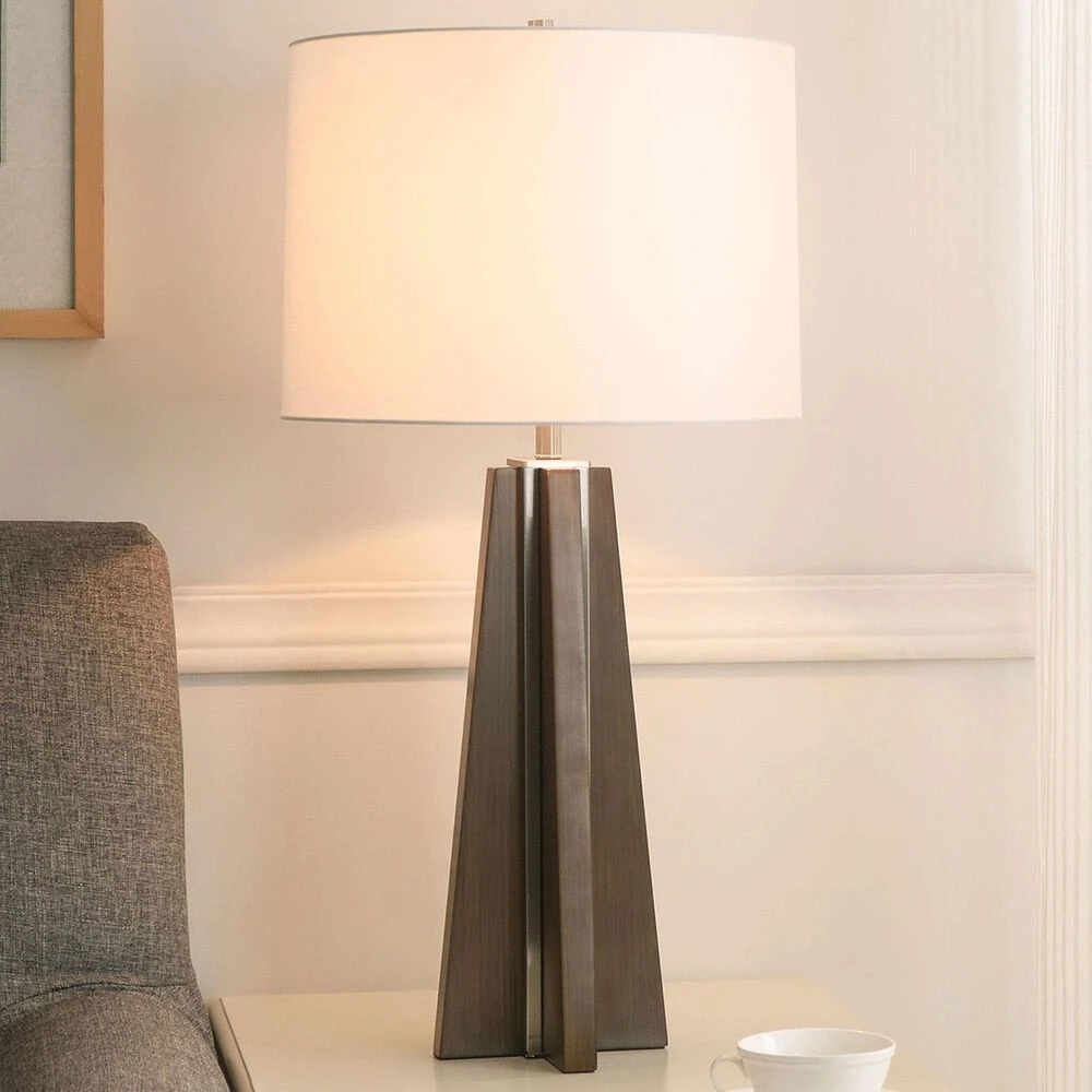 Geometric chic meets rustic natural style with this tall table lamp. Featuring a unique blend of mixed materials, the brushed steel accents pop against the rich simulated wood grain of the lamp body. A white drum shade creates brightly diffused light – ideal for use as a reading light or for task lighting in your work from home office or master bedroom nightstands.