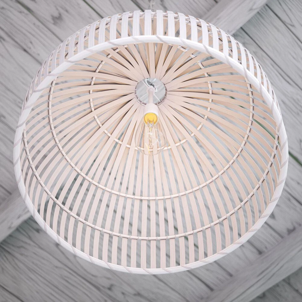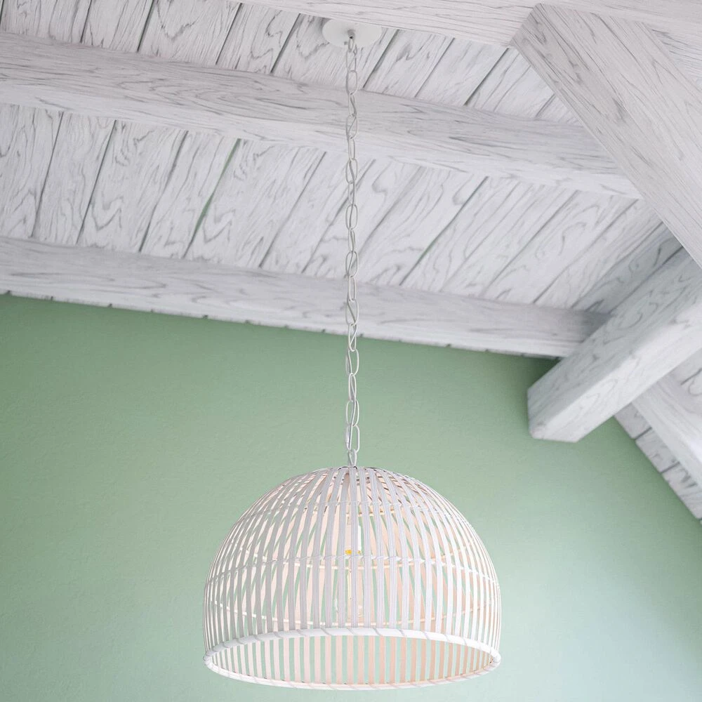Rattan has never looked so good – this stylish rattan dome pendant features a basket-like look in a sleek white finish. The rattan dome shade creates a bright, warm downlit glow – perfect for your boho living spaces. Vaulted and sloped ceiling compatible, place this rattan dome pendant in your natural, tropical, or contemporary dining room or entryway.