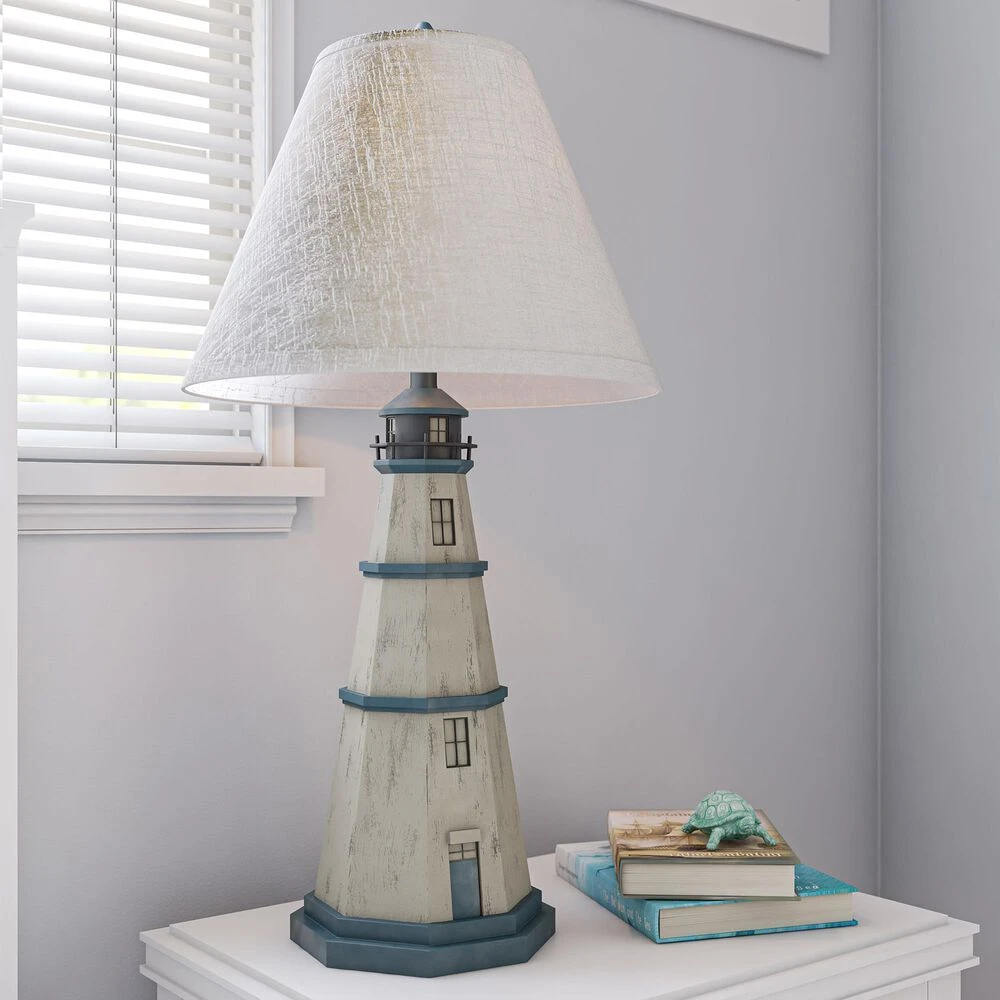 Straight from the shores of Cape Cod to your coastal living room, this coastal lighthouse novelty table lamp provides a hefty dose of nautical style with its vintage lighthouse appearance. Shaped just like an iconic East coast lighthouse and topped with a white fabric linen shade, this tall table lamp will provide your coastal living room with bright, room-filling illumination from on top of your end tables. With its gorgeous, iconic New England style lighthouse body and textural white tapered shade, this lamp invites you to sit and enjoy the soft, welcoming glow in your nautical-inspired living space. This ultimate coastal piece is the perfect finishing touch for your beachside cottage.