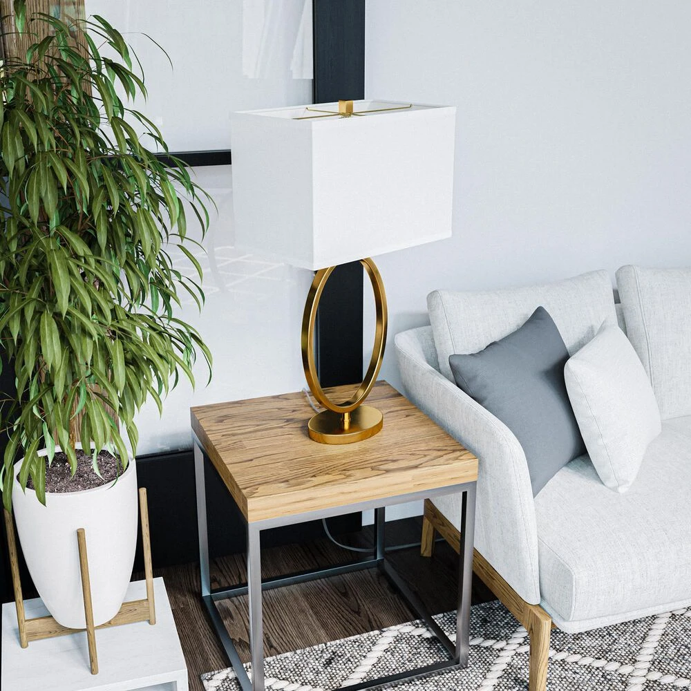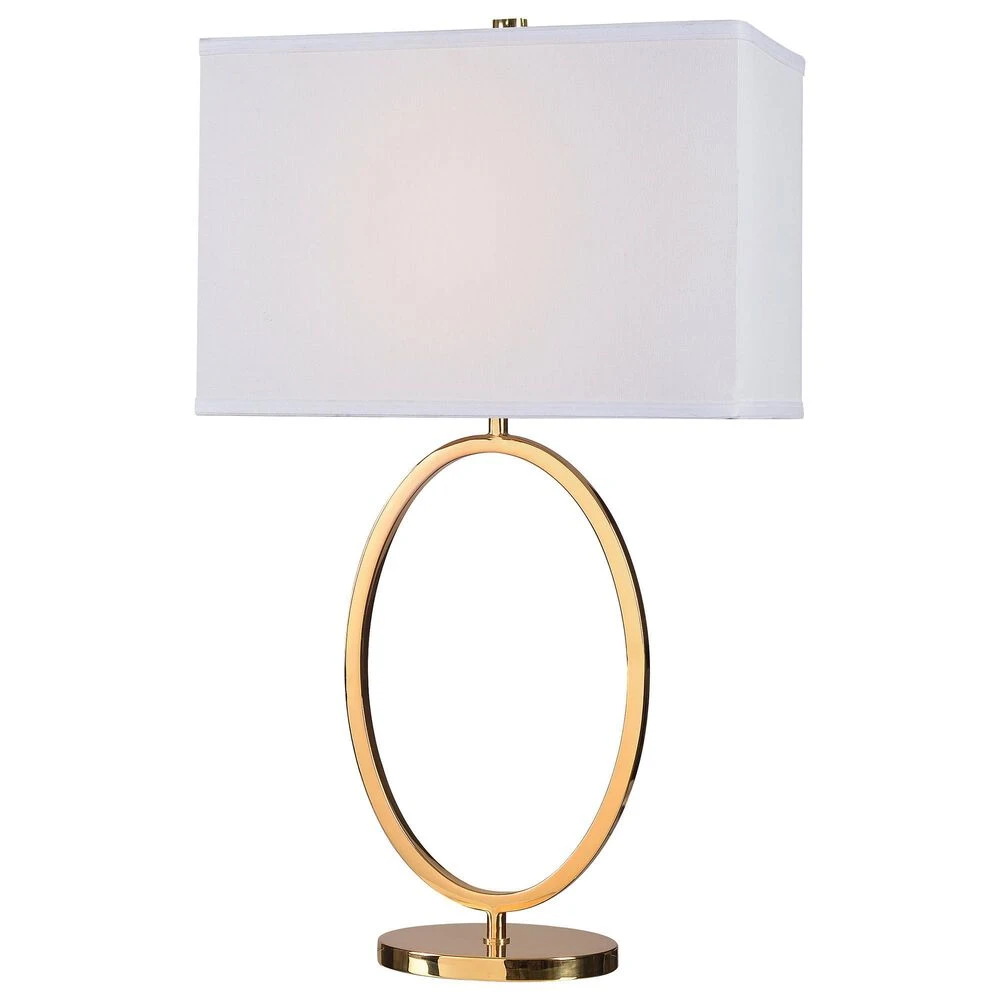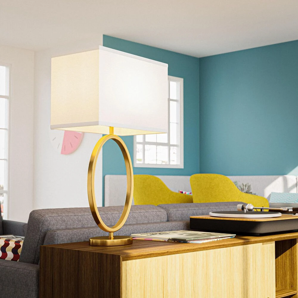 Ring in perfect Art Deco-style with this modern minimalist metallic table lamp. The oval base is finished in a glistening gold thats as modern as it is beautiful. Accented by a crisp white shade, the look is clean and uncluttered perfect for use as a metallic accent piece in your uncluttered minimalist living room. Place on top of your end tables in your loft style living room for a glam accent, or on top of your nightstands in your bohemian bedroom. This glimmering accent creates a bold statement without overpowering the room.