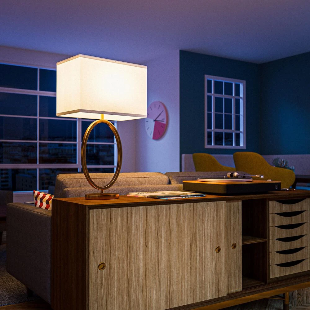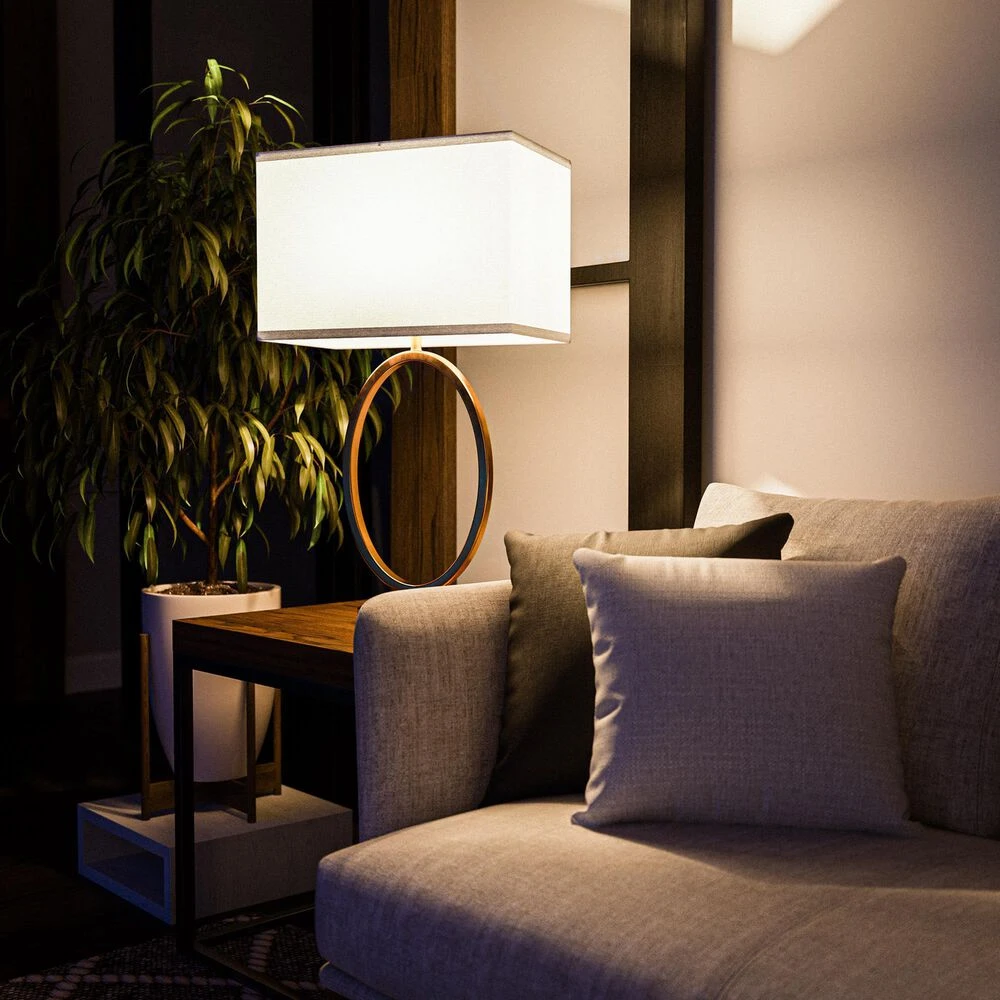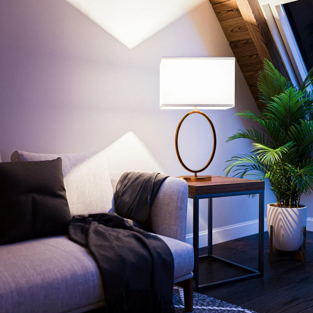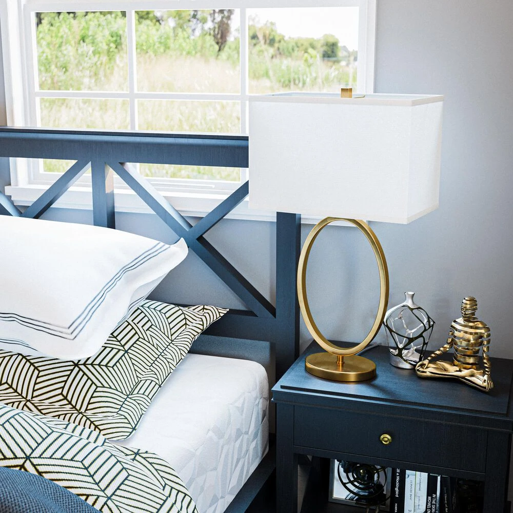 Ring in perfect Art Deco-style with this modern minimalist metallic table lamp. The oval base is finished in a glistening gold thats as modern as it is beautiful. Accented by a crisp white shade, the look is clean and uncluttered perfect for use as a metallic accent piece in your uncluttered minimalist living room. Place on top of your end tables in your loft style living room for a glam accent, or on top of your nightstands in your bohemian bedroom. This glimmering accent creates a bold statement without overpowering the room.