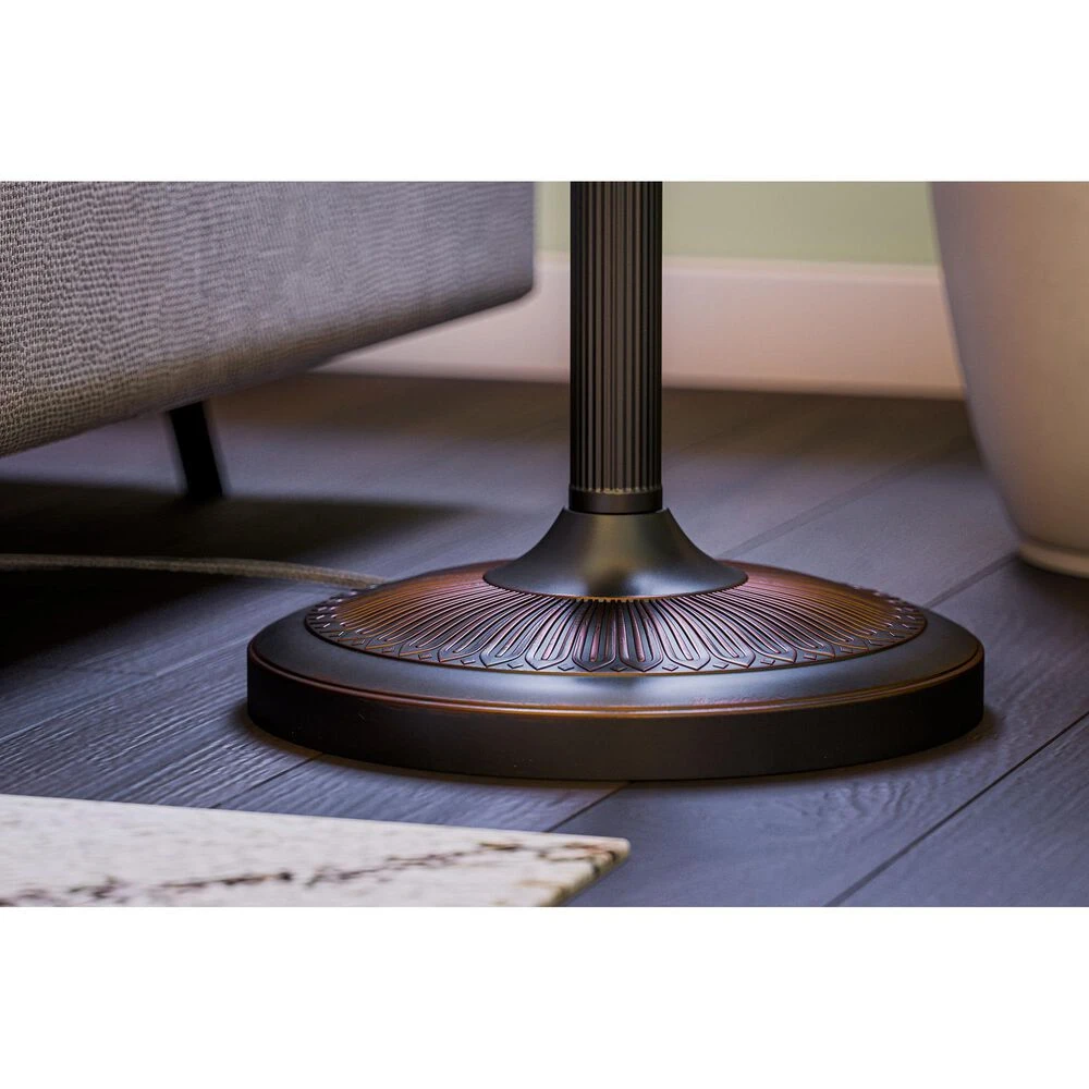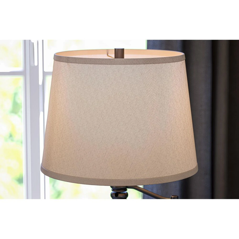 This floor lamps traditional reeded candlestick base is brought up to date by an oatmeal tapered drum shade and the unique warm tones in its copper bronze finish. With a wide range of motion thanks to its swing arm construction, this floor lamp provides easy and accessible illumination options, simply position the swing arm where you need it, when you need it and tuck it away when your task is complete. With a slim profile perfect for tucking behind furniture, this floor lamp is perfect for minimalist living rooms or small space apartments thanks to its function-forward design and stylish classic looks.