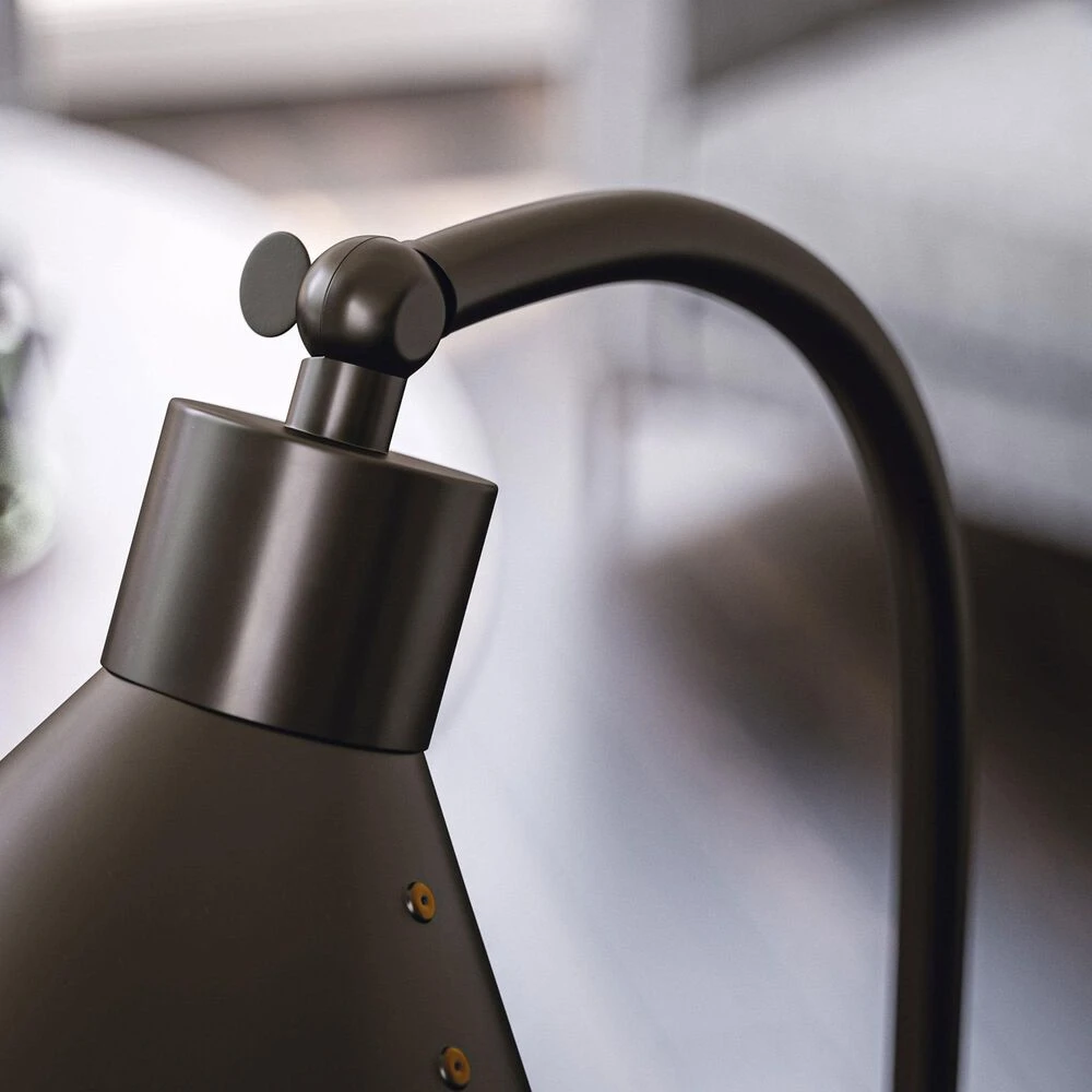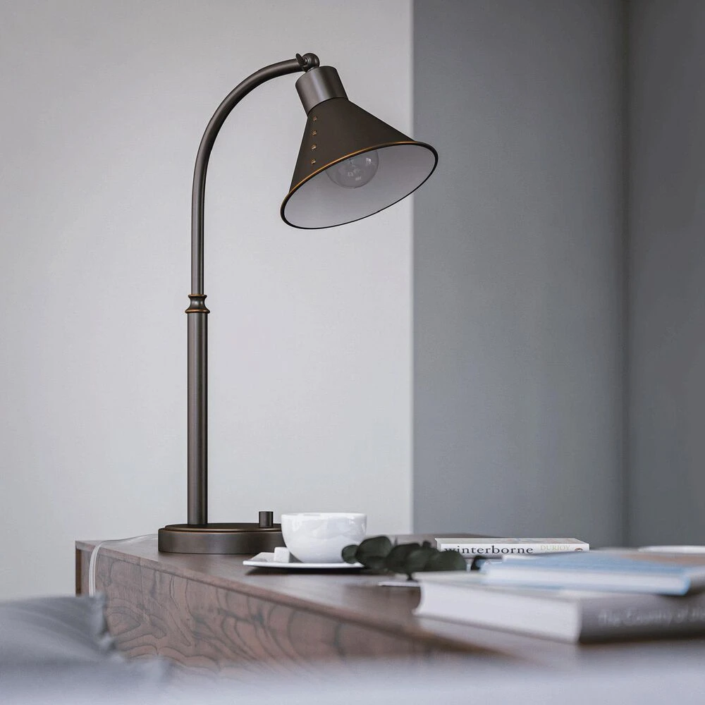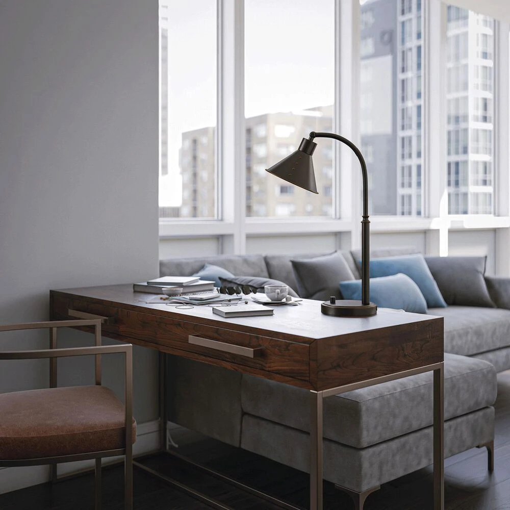 Standing at 23 inches high, this desk lamp features an on/off switch on the rounded base of the light, giving you easy access to it anytime from anywhere at your desk. With a swiveled shade metal shade, the desk lamp provides downward facing light to provide you with plenty of coverage across your projects. With a rich oil-rubbed bronze finish and a conical lampshade that sports sleek rivet-detailing, the lamp serves as the perfect lighting element in a casual or industrial-inspired workspace, creating plenty of bright directional task lighting for your desktop – perfectly for working from home.