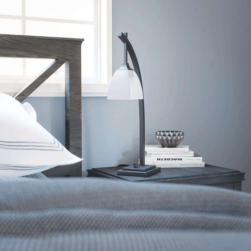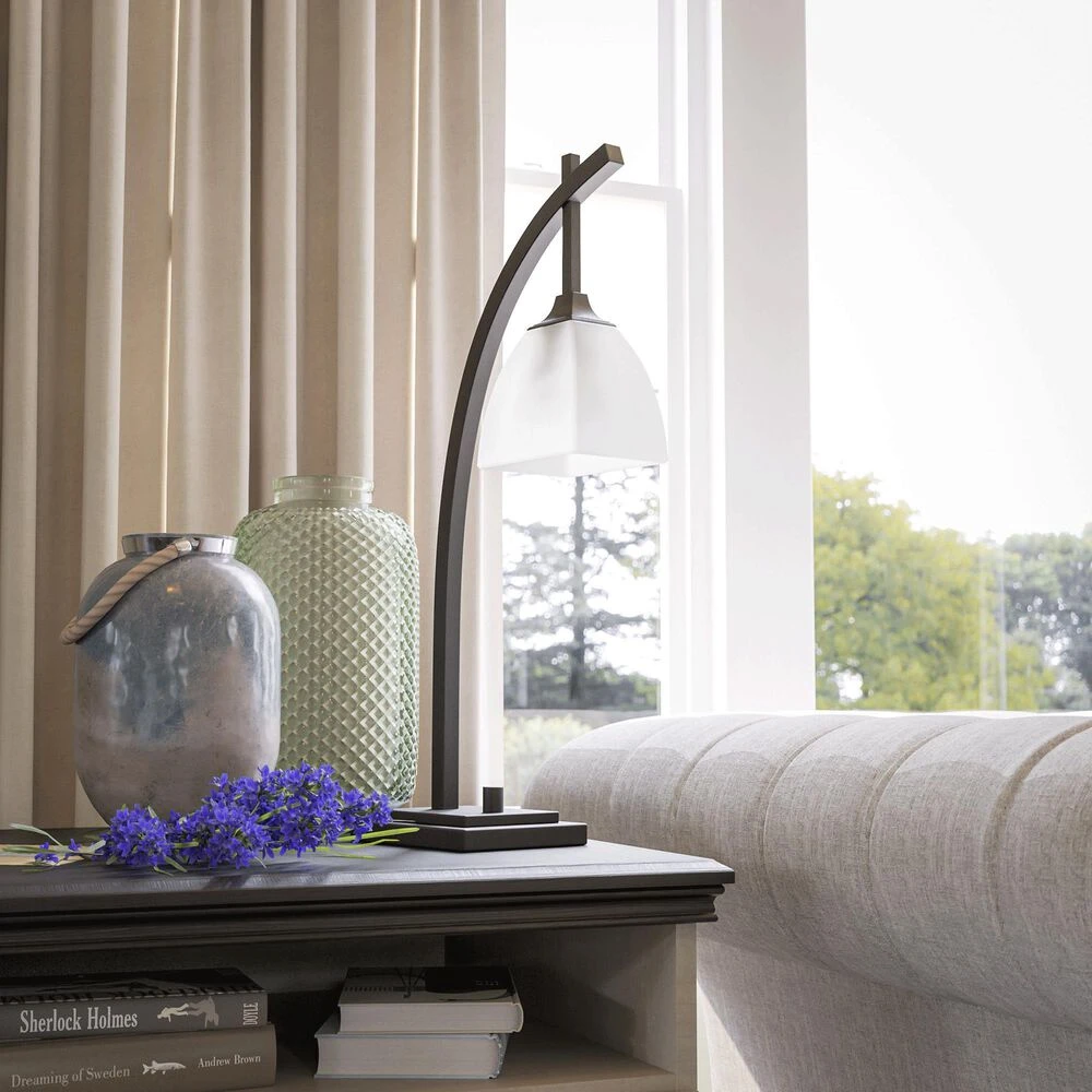 Beautify your home or office with this transitional table lamp collection, simple yet impactful design elements provide the perfect balance of form and function. Finished in a rich golden flecked bronze, and featuring a soft white rectangular shade, the angular supporting arm of this lamp allows for focused yet out of the way illumination for reading or other deskside tasks. The single light model rests at 24-inches in height and features a desktop space-saving footprint of only 6-inches in width. Each model features an easy to access on/off switch found in the stepped design of the base.