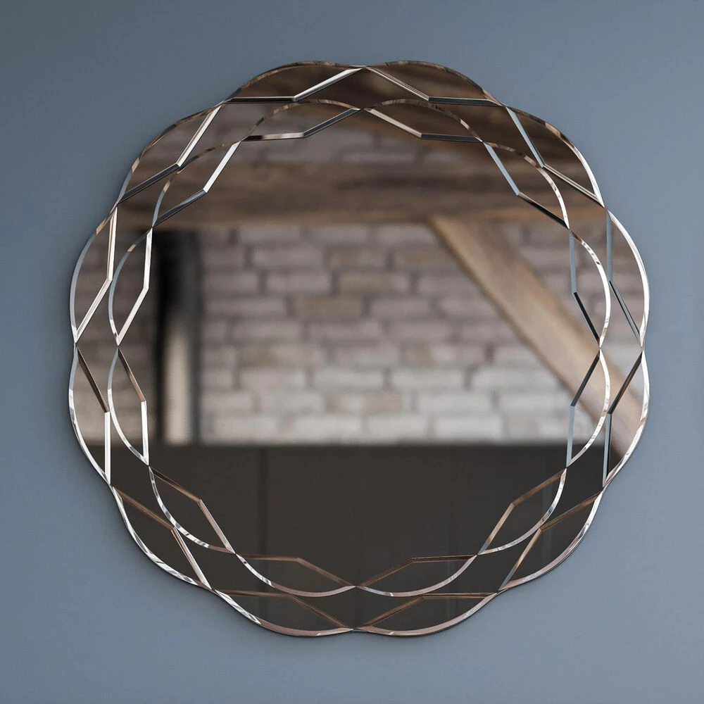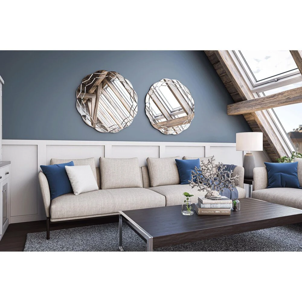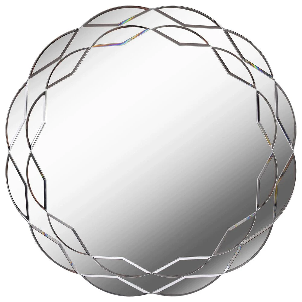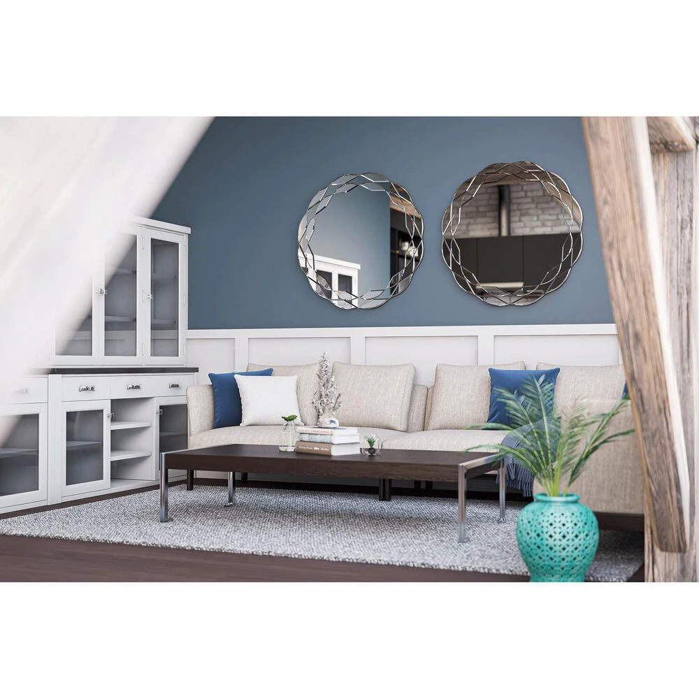 Soft curved edges and a unique mirror-within-mirror effect gives this round wall mirror a wonderfully versatile look. This frameless mirror is surrounded by a series of small beveled mirrors, helping to amplify the natural lighting in any room. Perfectly complementing any glam, transitional or casual space, this mirror is easy to hang thanks to pre-installed D-Rings no leveling required. When placed over an entryway table, the high-quality mirror finishing and a large central surface allows you to quickly check your makeup and outfit before heading out the door.