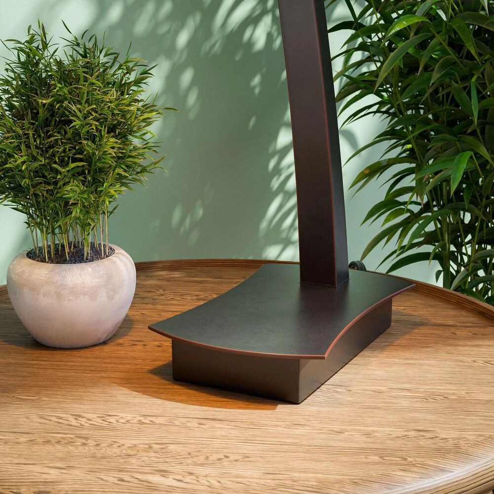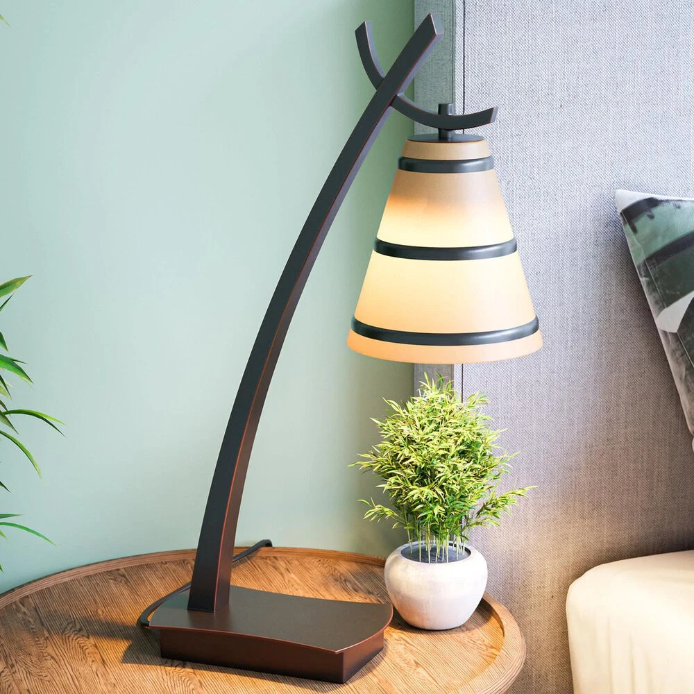Bring a sense of calm to your space with this globally-inspired table lamp. This lamp features Asian-Inspired tapered arches that provide clean lines and an exotic presence to your end tables, nightstands and home office desk. The sculptural curves are finished with a warming oil-rubbed bronze that glimmers in the light of the amber glass shade. Use the lamp to illuminate your terrarium filled with succulents and air plants to further the Zen feel in your home.